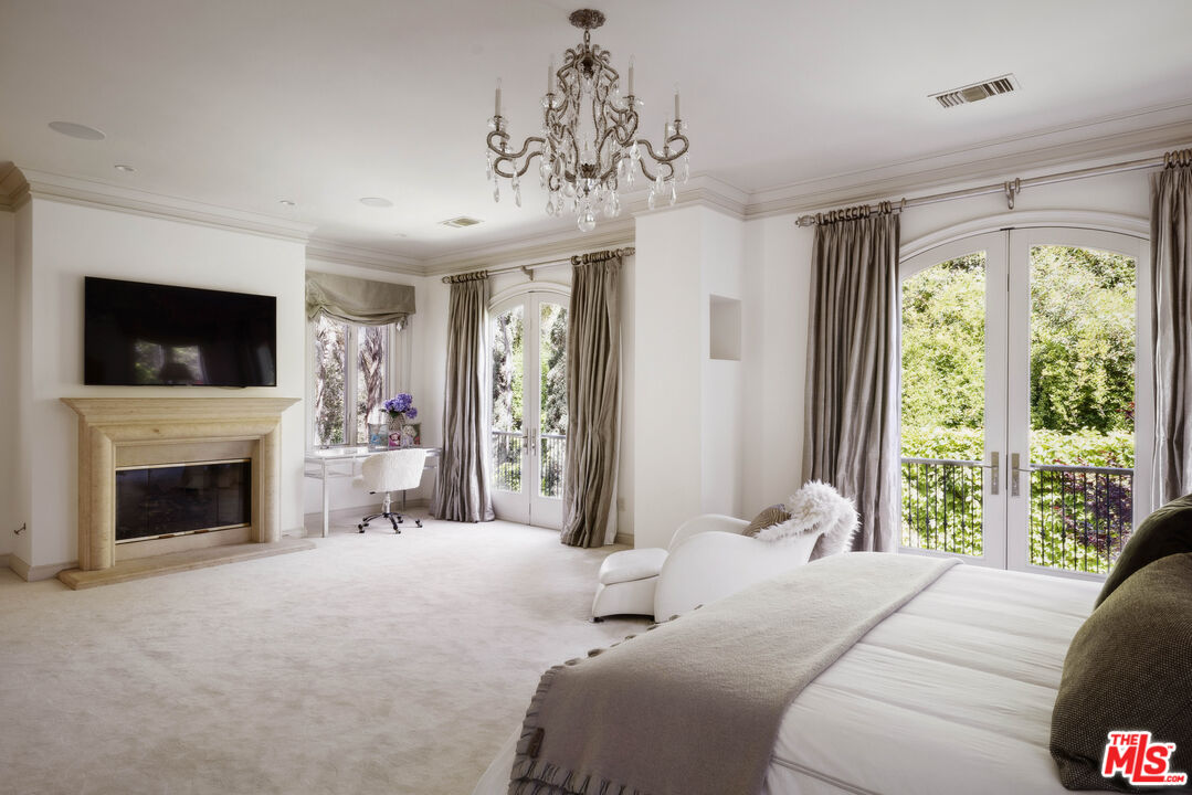 Set behind gates in prime Bel Air, this stunning custom Mediterranean estate blends timeless elegance with modern comfort. Grand in scale yet warm in design, the home offers formal and informal living spaces lined with French doors that open to lush, private grounds ideal for entertaining and everyday living. The main level features an elegant living room with fireplace, great room with wet bar, paneled library, maid's quarters, formal dining room, and a gourmet chef's kitchen with top-tier appliances. Upstairs includes a media room and four ensuite bedrooms, including a luxurious primary suite with sitting area, fireplace, showroom closets, and marble bath. The resort-like setting is surrounded by mature trees and includes manicured lawns, a large pool and spa, dining pergola with outdoor fireplace and dog run. Complete with Sonos sound and timeless detailing throughout, this estate offers privacy, scale, and enduring elegance in one of L.A.'s most coveted neighborhoods.