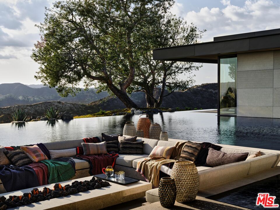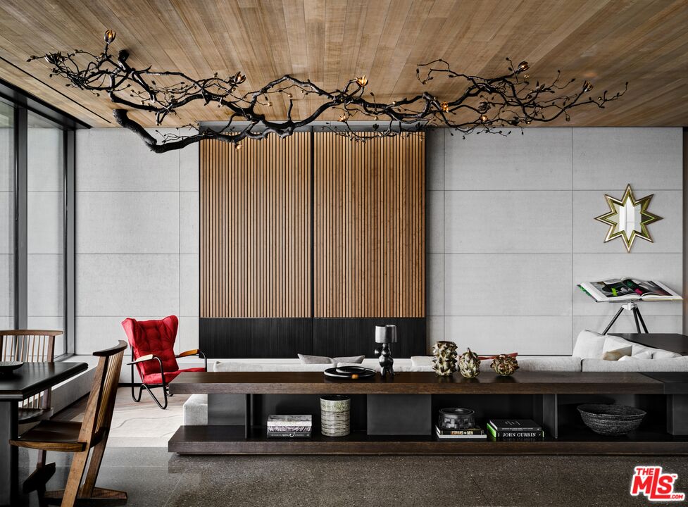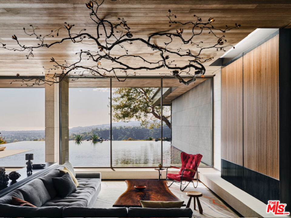 Set within a premier enclave of Trousdale Estates, this 6,500-square-foot architectural masterpiece merges contemporary luxury with the distinctive character of midcentury-modern design. Surrounded by panoramic views of the Santa Monica Mountains, this two-bedroom, four-bathroom estate offers an unparalleled living experience in one of Beverly Hills most coveted neighborhoods. In collaboration with Lucas Design Studio, the residence embodies soft contemporary architectural precision and material mastery, featuring an array of exotic finishes selected for their beauty and integrity, along with four sculptural gas fireplaces that bring warmth and architectural presence to the home. Floor-to-ceiling windows invite natural light and stunning vistas into every room, creating a harmonious flow between indoor and outdoor living. A striking flame-sprayed nickel wall extends from the exterior into the living room, setting the stage for a curated collection of design icons, including a curved Vladimir Kagan sofa, an Ado Chale coffee table, and a Paul Evans I Wavy front credenza, all resting atop a custom wool and silk rug from Fedora Design. Art takes center stage in this residence, with commissioned works throughout, including a mesmerizing light sculpture by LA artist David Wiseman that illuminates the sunken TV lounge. Inspired by the surrounding landscape, Wiseman cast acorns from the property's trees, incorporating them into the intricate design. At night, the sculpture transforms the space into an enchanting retreat, evoking the feeling of relaxing beneath a starlit canopy. The dining room exudes sophistication, with a Herve Van der Straeten dining table, complemented with dining chairs by designer Hans Wegner. The open-concept kitchen is equally striking, featuring wire-brushed and cerused rift oak cabinetry, quartzite countertops, and dazzling custom lighting. The primary suite is a unique sanctuary, with a custom-upholstered bed, luxurious textiles from de Le Cuona, and designer pieces by Roger Capron and Paul Evans. The vast spa-inspired primary bath is a study in exquisite stonework with two Toto toilets enhancing the spa-level experience. Midcentury Swedish flatweave rug, and vintage sconces elevate the guest suite's atmosphere of curated luxury. Floors are Terrazzo, bantered by bordered by limestone edges. Outside, the infinity pool extends to the edge of the living room, creating a seamless visual connection between water and sky. Thoughtfully designed outdoor spaces offer ample room for relaxation and entertaining, with breathtaking views serving as the perfect backdrop. A rare offering in a historic enclave once home to legends like Frank Sinatra and Elvis Presley, this residence is a masterclass in design, blending artistry, luxury, and architectural integrity. This estate is being offered furnished as curated for someone desiring a highly designed atmosphere throughout. Particular attention was paid to the lighting design for the home, pool, and landscaping, to the point where the homeowners insist that interested Buyers experience the property both during the day and in the evening to fully appreciate it. Highlights include Italian iGuzzini laser lighting integrated throughout the home. The residence is prominently featured on the sites of its creative partners - Lucas Studio (lucasinterior.com), TLD Lighting Design (t-ld.com), and Hocker Design Group (hockerdesign.com) offering an additional lens into the home's exceptional design.