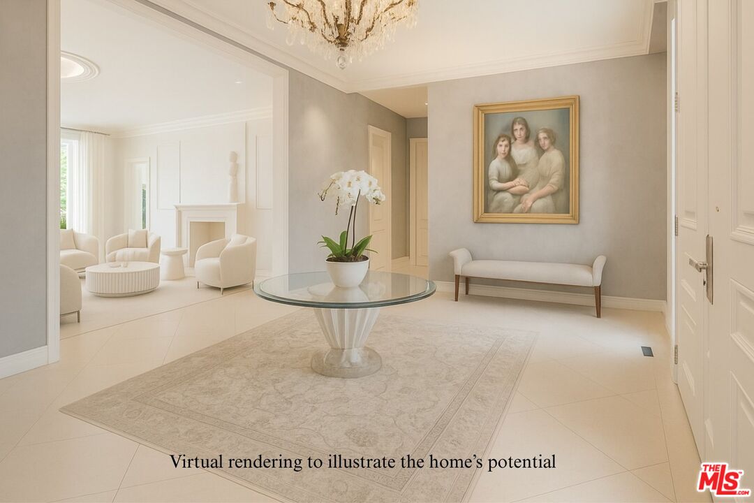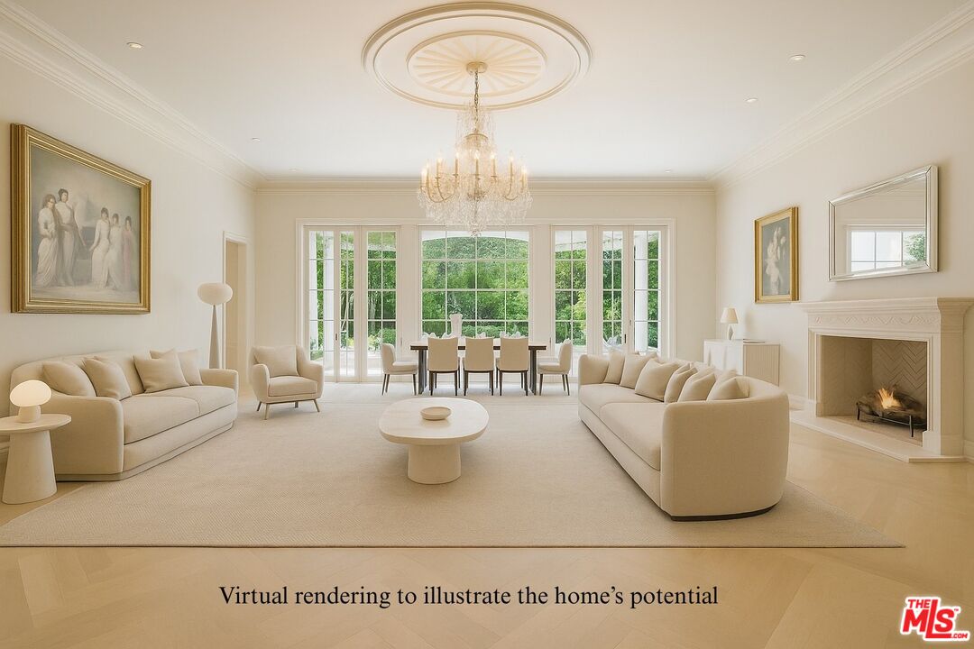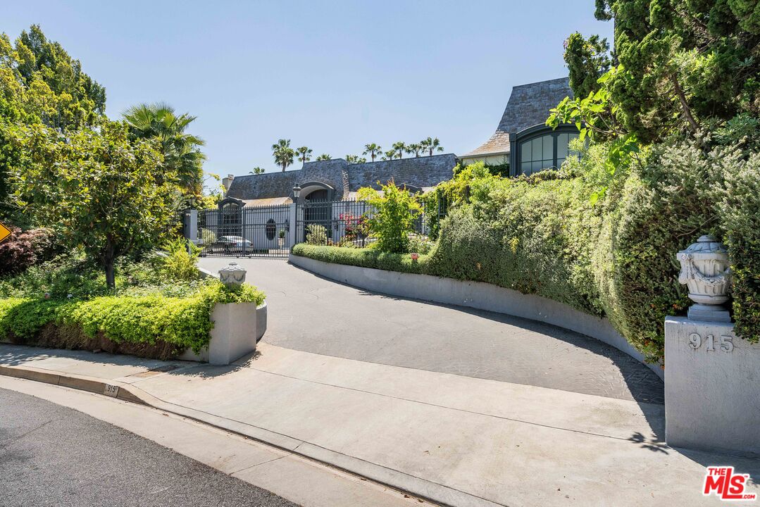 Introducing 915 Hartford Way, a timeless French Regency estate nestled behind private gates in prime Beverly Hills, just moments from the iconic Beverly Hills Hotel. This architectural gem blends elegance, sophistication, and serenity across beautifully landscaped grounds. Step through grand double doors into a dramatic two-story foyer. The formal living room showcases a stately fireplace and walls of glass framing lush surroundings. An open floor plan connects refined living spaces, including a formal dining room with soaring ceilings and tranquil views, and a charming breakfast room with direct outdoor access. The gourmet kitchen is a chef's dream, featuring a central island, top-tier appliances, and seamless design. A cozy family room/den boasts rich wood floors, custom built-ins, a fireplace, and an adjoining office. The luxurious primary suite offers a peaceful retreat with fireplace, dual walk-in closets, and a spa-like bath with soaking tub and walk-in shower. Two additional guest suites on the main level feature custom finishes and garden views. Upstairs, find a spacious guest room with its own bath and an expansive bonus room ideal for entertainment or play. Outdoors, enjoy a resort-style oasis with lush gardens, a covered terrace, pool, fire pit, bar, and multiple dining areas and lounge spaces. Additional amenities include maid's quarters, a wine cellar, and a 3-car garage. A rare offering of privacy, luxury, and proximity to world-class shopping, dining, and entertainment. Shown to prequalified buyers only. (Virtual renderings to illustrate the home's potential.)
