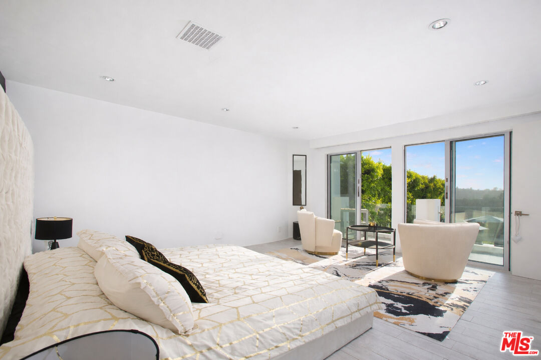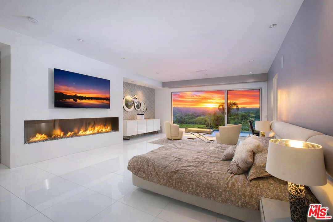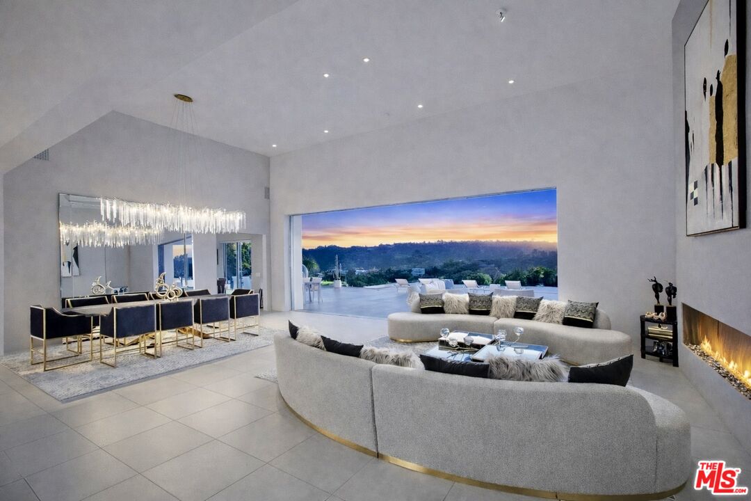 Privately gated and positioned at the top of a quiet Beverly Hills cul-de-sac, this refined two-story architectural contemporary residence is designed for both privacy and impact, offering sweeping 180-degree panoramic canyon and sunset views with no roofline obstruction. Soaring approximately 15-foot ceilings and walls of Fleetwood pocket doors open to expansive outdoor living areas, creating exceptional indoor-outdoor living with direct access from every principal space. Filled with natural light, air, and views throughout, the home is further enhanced by a retractable skylight in the hallway, dramatic double-height living and dining spaces, and a custom chef's kitchen with professional-grade Miele appliances, an oversized center island, breakfast nook, two dishwashers, wine fridge, and espresso machine. The residence offers two primary suites, one opening to the pool and backyard and one with a private balcony, including one serving as a true private retreat with dual sitting areas, separate full bathrooms, separate walk-in dressing rooms, motorized blackout and daytime shades, and one of the home's three linear gas fireplaces. Three additional en-suite bedrooms are thoughtfully positioned for comfort and discretion, including a separate guest wing and lower-level suites. Additional highlights include a powder room, separate family room, executive office, media room, entertaining bar, space for a gym, laundry room, staff quarters, and multiple outdoor entertaining zones. A full barbecue area with close access to the kitchen adds practical ease for everyday use and effortless entertaining, while the expansive covered outdoor entertaining area beautifully extends the interior living space and offers the flexibility of both covered and open-air enjoyment. The infinity-edge pool is complemented by beautifully landscaped lawn areas that surround the property, with grass across the front, along both sides, and throughout the backyard, creating a lush and serene setting from every angle. Complete with a state-of-the-art security system including cameras and alarm, two rooftop solar panel systems, mature hedging for exceptional privacy, a two-car garage, and additional driveway parking for two vehicles, this architectural estate offers a rare combination of privacy, scale, comfort, and refined modern living.