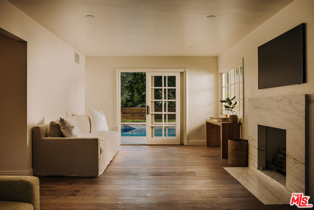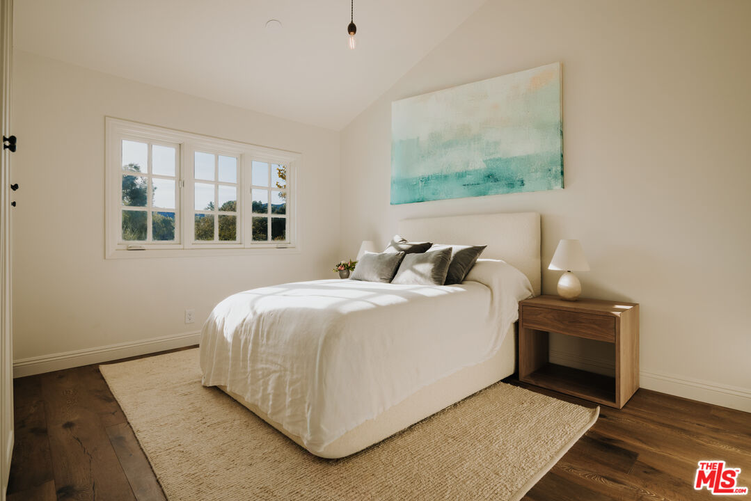 Perfectly tucked away on a peaceful cul-de-sac in Mandeville Canyon, this exquisitely reimagined traditional home offers warmth, sophistication, and a seamless blend of classic charm with modern comfort. Step inside to discover soaring vaulted ceilings and sun-filled interiors that set a warm and welcoming tone throughout that exude an inviting elegance. The main level unfolds with a spacious formal dining area, a gourmet chef's kitchen, and a sunken living room centered around an elegant fireplace. The chef's kitchen showcases generous granite countertops, custom cabinetry, and seamless flow into the family room complete with built-ins, recessed lighting, and French doors that open to a serene outdoor sanctuary. A convenient downstairs bedroom and bath offer flexibility for guests or an ideal home office. Adjacent you will find a family lounge provides direct access to the backyard perfect for children or casual entertaining. Extensive windows and doors invite natural light and viewpoints of the lush backyard, creating a seamless indoor-outdoor connection ideal for entertaining. The interiors extend gracefully to the private backyard oasis, where lush landscaping frames a large swimmer's pool, a relaxing spa, and grassy yard ideal for lounging or gathering around the fire pit beneath the stars. Upstairs, three additional bedrooms offer comfort and tranquility, including a serene primary suite that captures the essence of Mandeville Canyon living. Every space feels calm, curated, and connected to nature. Additional features include Rose Uniacke lighting throughout, Waterworks plumbing and a coveted corner lot that offers both privacy and curb appeal. With ample garage space for parking or storage, this home perfectly blends functionality and style. A true Mandeville Canyon gem, this residence embodies the best of Southern California living, where comfort, beauty, and community come together.