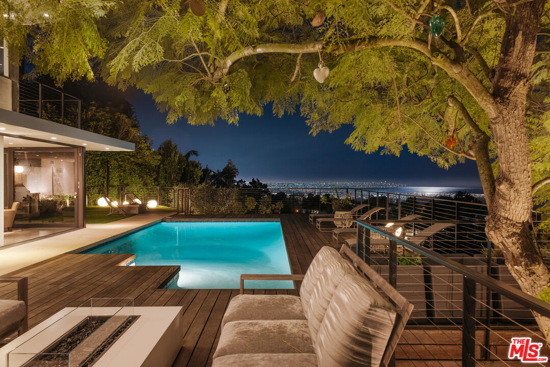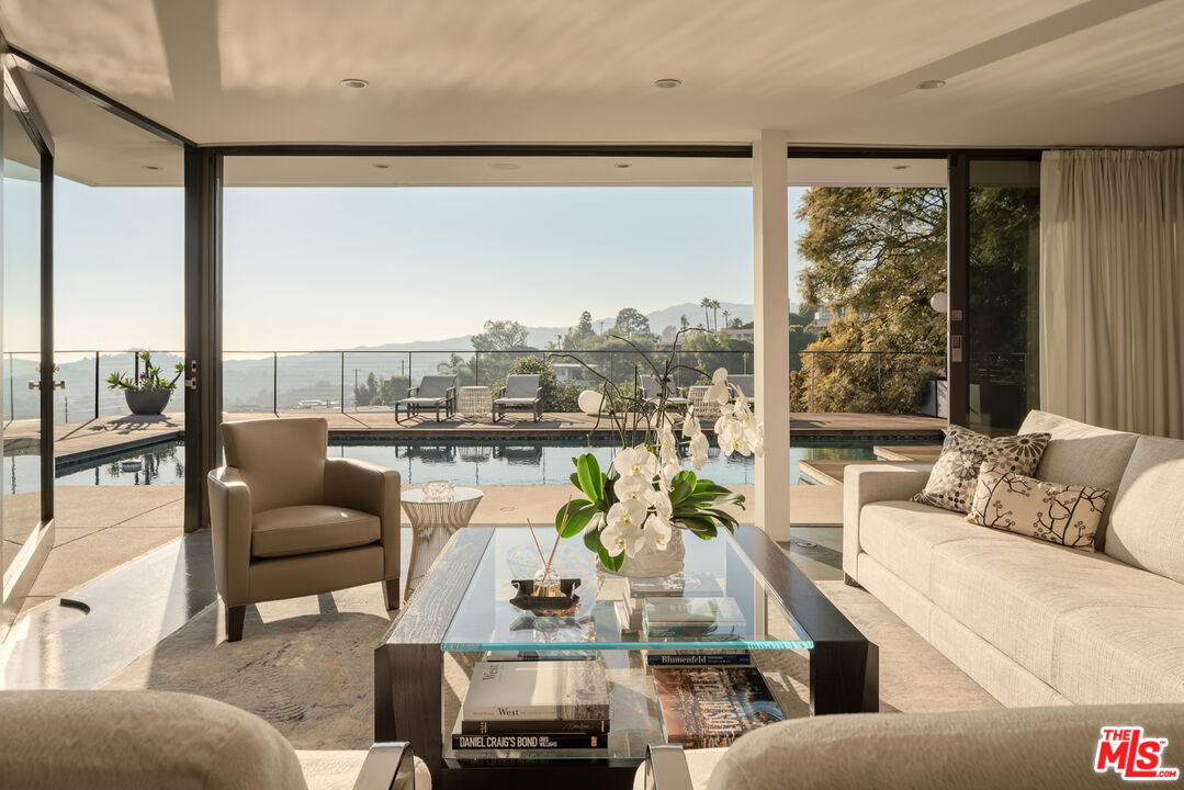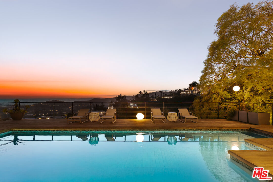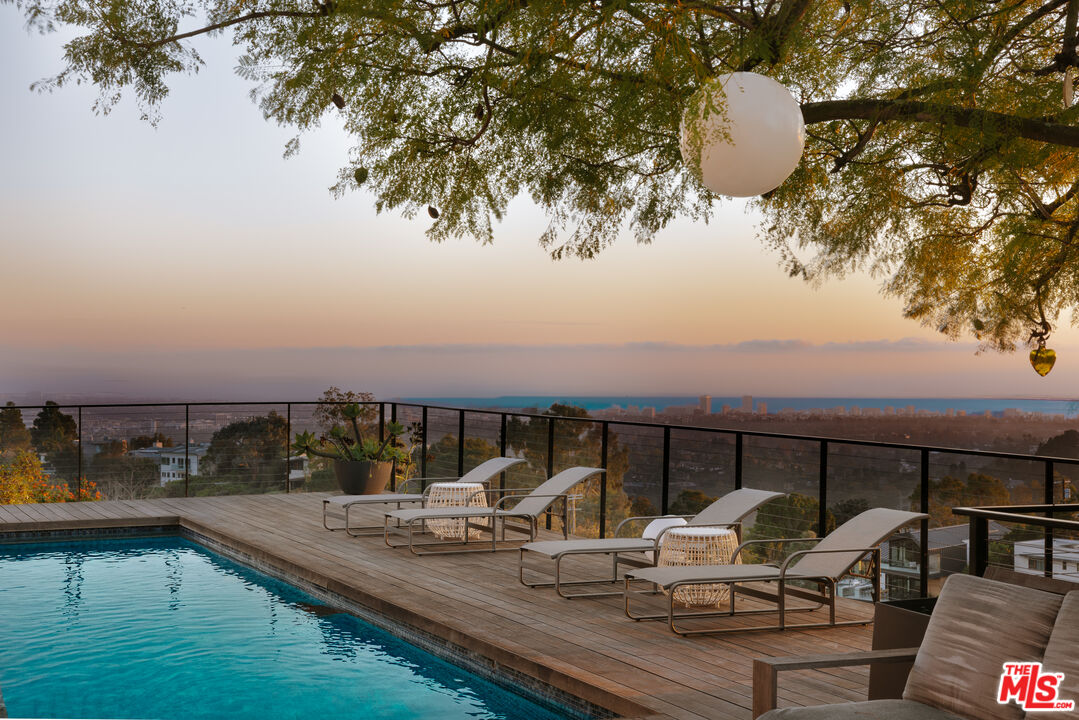 As featured on cover of Los Angeles Magazine, Award-winning 21st century contemporary interpretation of a mid-century home, off prestigious Tigertail Rd, with floor to ceiling windows, huge deck and pool opening to endless ocean views. Perfectly positioned on a quiet cul-de-sac, the home captures explosive city and unobstructed ocean views, including Downtown Los Angeles, Santa Monica, Palos Verdes, Catalina Island, and the Santa Monica Mountains. Every sunset becomes a living art piece. Inside, the home is flooded with natural light, framed by floor-to-ceiling windows and meticulously crafted woodwork. The open-concept kitchen with a soaring ceiling anchors the main level, offering seamless flow to the second story and bringing light into every corner. Each room is intentionally oriented to the view, creating a constant connection to the landscape and the serenity that defines this neighborhood. Upstairs features two ensuite bedrooms, one includes a steam room and each with their own private patios to enjoy the views. There is flexibility to reconvert one of the spacious primary closets back into a third bedroom. A perfect home to entertain and enjoy indoor outdoor California living, the large pool sits over the canyon with nonstop city and ocean views, complemented by a cozy fire pit ideal for gathering, relaxing, and watching sunsets. Thoughtfully designed outdoor lighting and custom uplighting create a dramatic atmosphere in the evenings. Below, the owners terraced a private wellness zone featuring a sauna and cold plunge. Nearby hiking trails complete the idyllic lifestyle. Every detail is turnkey, clean lines, warm textures, thoughtful materials, and a timeless aesthetic that honors the home's architectural roots while elevating it for modern living. For the buyer who prioritizes architecture, privacy, and unforgettable views, this Brentwood home stands alone.