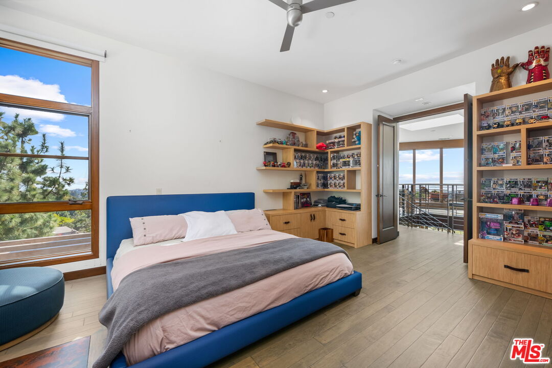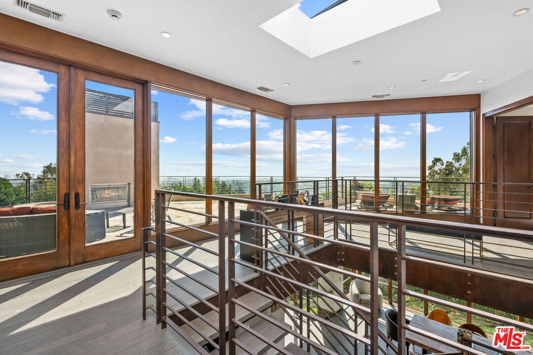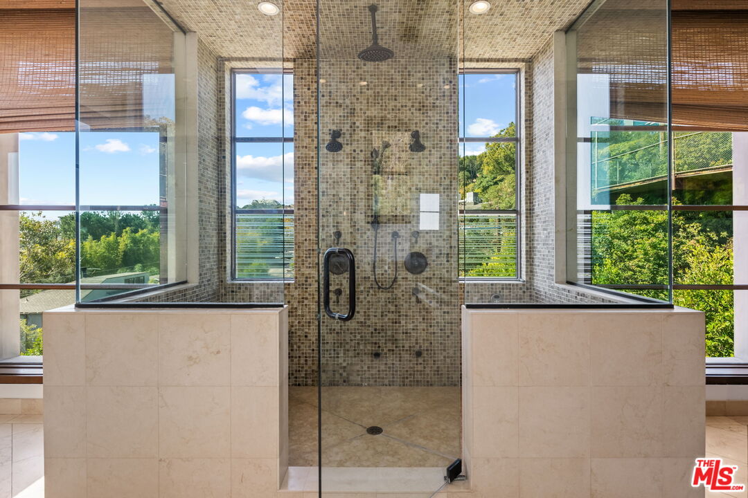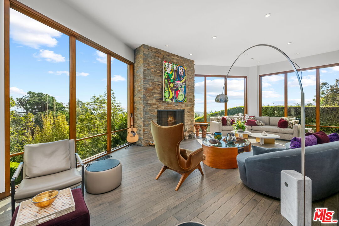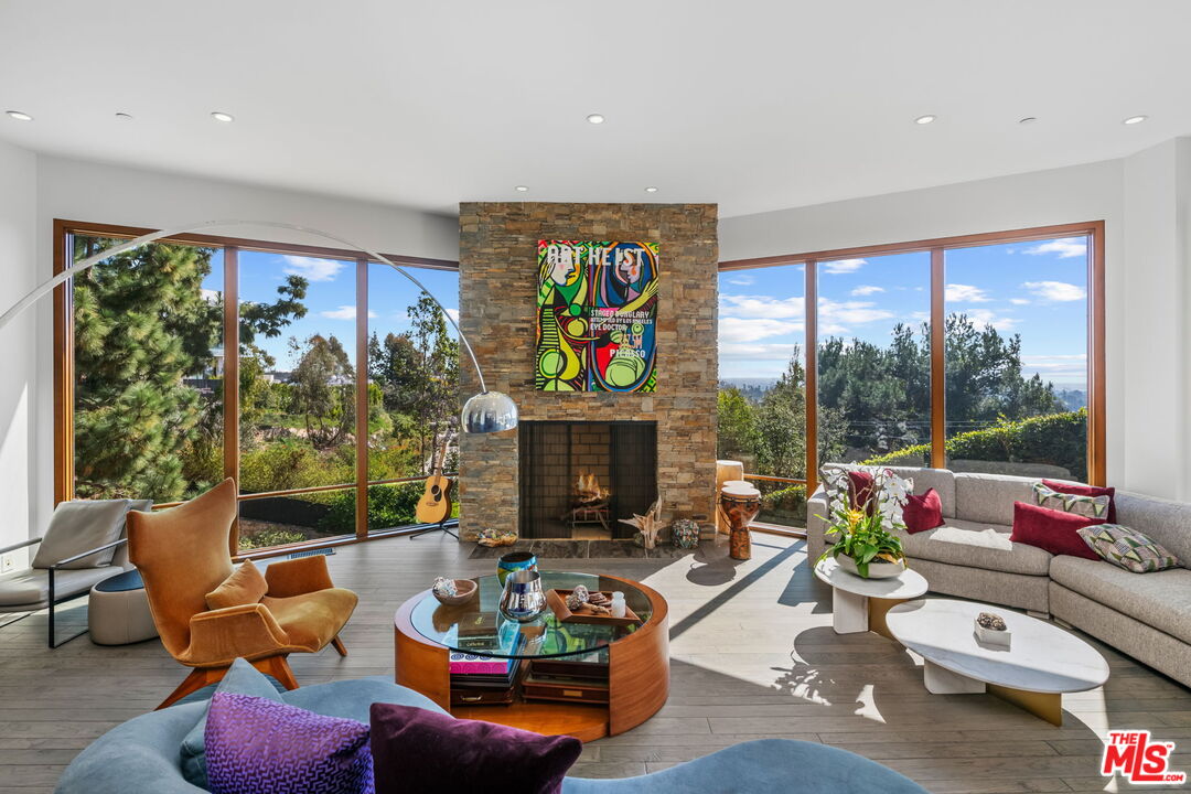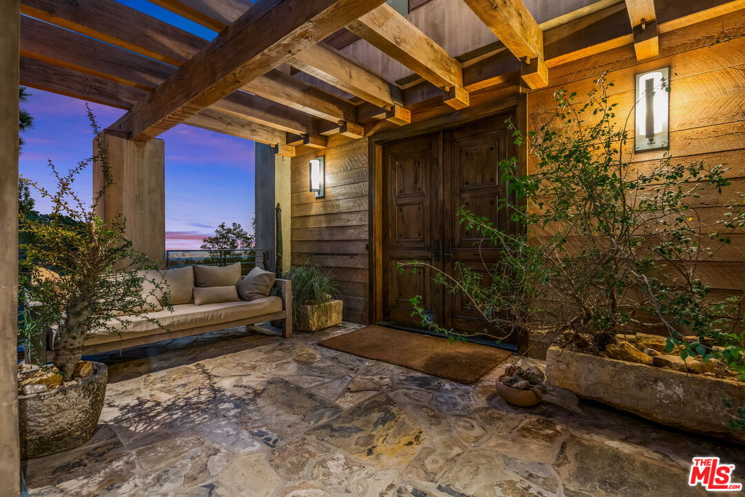 This architectural gem blends the charm of a luxury chalet in the mountains of Aspen with modern touches. The home, with its open floor plan and floor-to-ceiling windows throughout, amplifies the breathtaking views of the ocean, city, and mountains-truly one of a kind! Extremely private and situated on a meticulously terraced 22,500 sq. ft. lot, the property features a putting green, pool, BBQ area, private lounging spaces, half-court, waterfall, and multiple seating areas/decks nestled in the middle of a forest. It offers absolute serenity and takes you away from the hustle of city life. The house boasts hardwood floors mixed with stone, high-end appliances, a private dining area, and soaring ceilings in the family room with jaw-dropping views. Numerous gathering areas-both indoors and out-invite relaxation and entertainment. The upper level features an oversized primary suite with a spa-like bath that exudes a resort-style ambiance and a tranquil, Zen-like atmosphere. The secondary bedrooms are rich in texture and make you feel like you're on vacation. As a bonus, the property includes extensive parking options. Located in Brentwood, this distinguished residence also offers close proximity to world-class dining, shopping, nightlife, and lies within one of the city's most coveted school districts.
