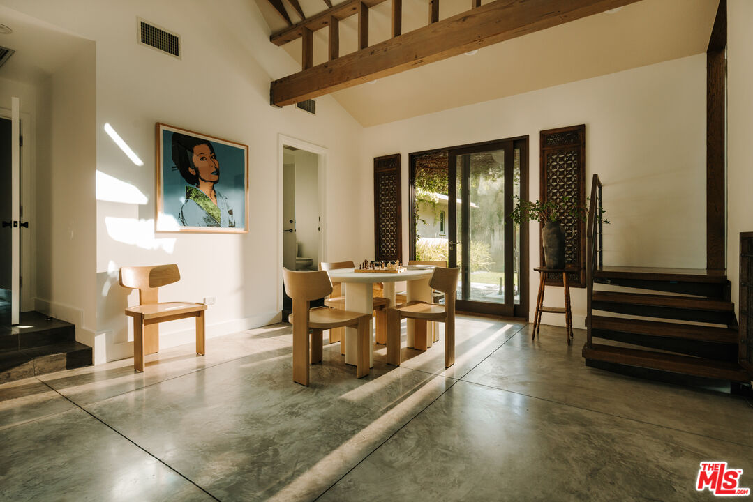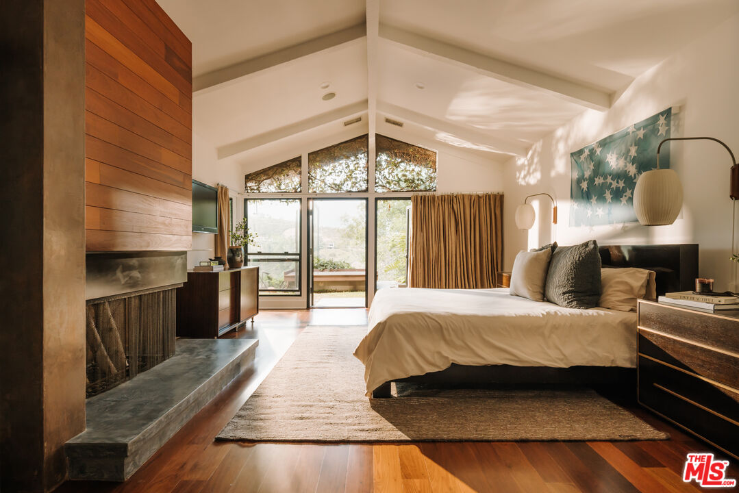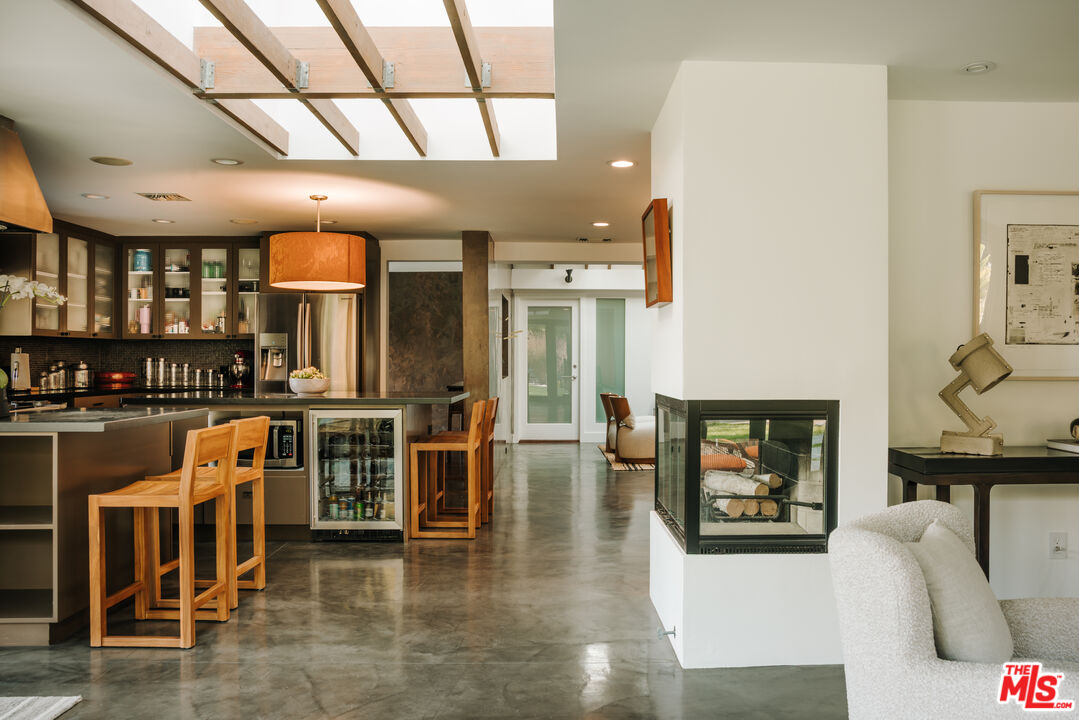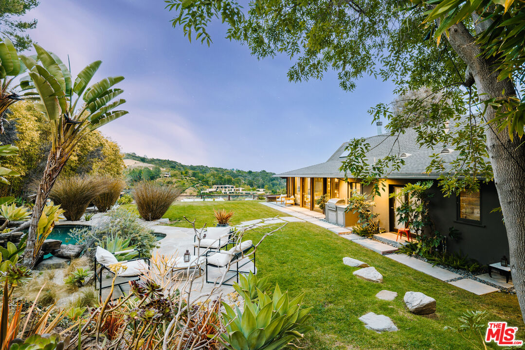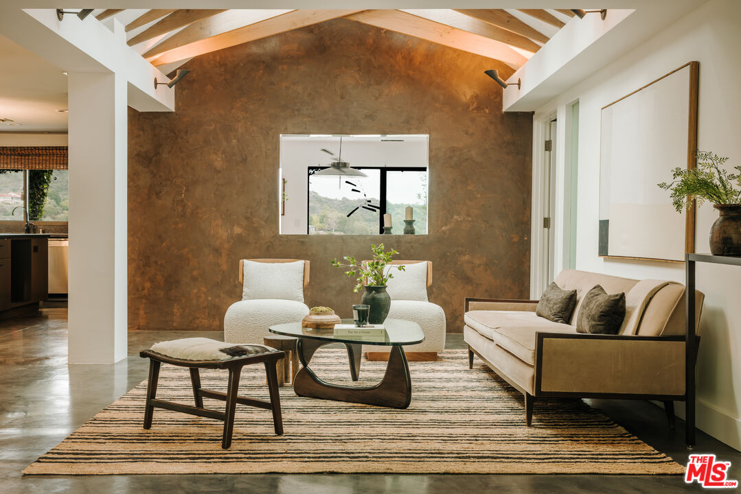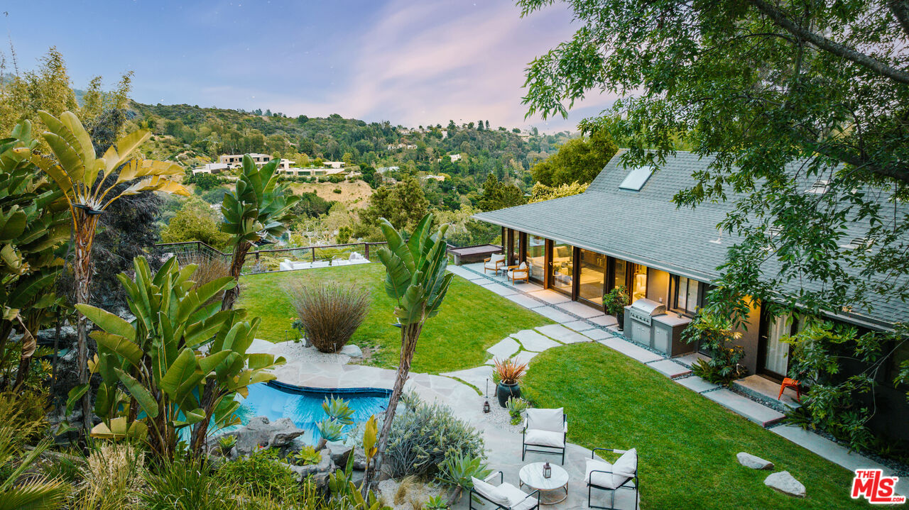 2220 Banyan Drive is a 5-bedroom, 4.5-bathroom residence spanning 4,107 square feet, seamlessly blending elevated design with everyday livability. Set behind a lush, landscaped entry courtyard with a peaceful fountain and generous grassy lawn, the home immediately sets a tone of serenity and sophistication. Through double front doors, a sun-drenched sitting room introduces the home's refined material palette; a striking mix of polished cement and warm wood that adds texture, depth, and architectural character throughout. To the right, sets a private room perfect for your at home work space or guest quarters. Adjacent is the spacious primary suite, where awe-inspiring canyon and city vistas greet you each morning. Anchored by a sleek fireplace, the primary bedroom also features a custom closet and a dramatic cement accent bathroom surrounded by bamboo, creating a retreat that feels both luxurious and grounded. The heart of the home unfolds around expansive living areas that feel both welcoming and cozy due to the unique placement of the 180 degree fireplace. A charming breakfast area offers a casual contrast to the more formal, intimate dining room, both thoughtfully positioned off the custom kitchen for ease and flow. The dining room is positioned with sliding doors to the breathtaking canyon views creating a truly special dining experience. The dual living room is framed by large glass, sliding doors that open seamlessly to a flat, grassy yard, resort-style pool, firepit, custom overhand deck and sweeping canyon/city views; ideal for entertaining or quiet evenings under the stars. In the west wing, two en-suite bedrooms sit parallel, ideal for siblings, with a nearby flex space that functions beautifully as a playroom, studio, or media lounge. Beyond, is a loft-style bonus area offering generous space for teens, in-laws, an office or visiting family, completing the home's highly functional and versatile layout. The loft features its own bathroom, outdoor deck and has both a living room and bedroom. With its rare combination of panoramic views, a spacious flat yard, and richly layered design, 2220 Banyan is a truly special offering in the hills - where form, function, and natural beauty meet.