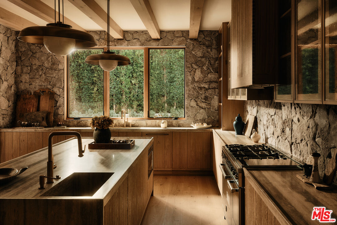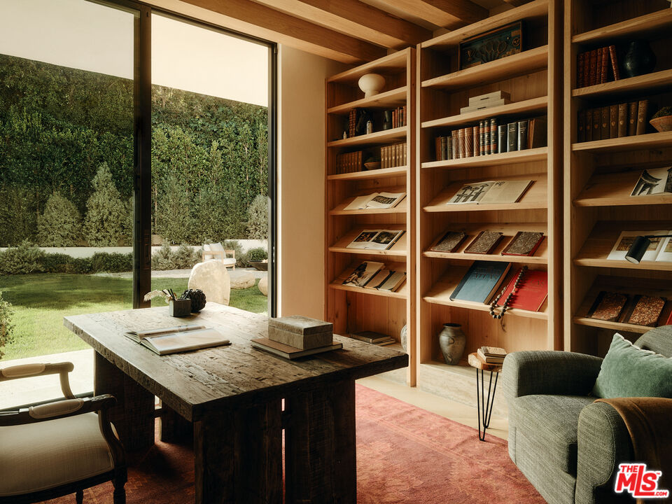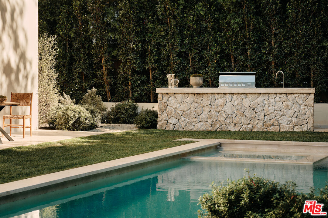 JVE Development Group and Jae Omar present Villa Antica, a newly built architectural residence in Brentwood, designed to evoke the feeling that it has stood gracefully in place for generations. Rooted in classical European influence and realized through a contemporary lens, the home is defined by natural materials, measured lines, and artisan craftsmanship. Offering an uncommon sense of privacy and scale, the residence spans five-bedrooms, six-bathrooms, and sits on a generous 9,618-square-foot parcel. A dramatic double-height entry sets the tone, unfolding into a series of thoughtfully composed living spaces crafted for both daily life and elevated entertaining. Interiors are filled with warm natural light and layered with textured woods, rough-hewn stone, and bespoke millwork. Reclaimed beams over 200 years old bring authenticity and depth, while leathered travertine and brass detailing reinforce a tactile richness. Sculptural lighting design creates a curated ambiance in the expansive great room, which flows effortlessly to the lush backyard through a wall of disappearing glass. At the heart of the home, the kitchen draws inspiration from the French countryside, blending beauty and utility with premium built-in appliances, a substantial center island, oak cabinetry, and a walk-in pantry. The kitchen opens to a sophisticated family room set around a floor-to-ceiling fireplace, while the adjacent dining room is complemented by a custom wet bar. Additional amenities include a glass-enclosed executive office, an immersive home theater, and a distinctive powder room featuring a 1920s French marble sink -- subtly reinforcing the home's collected, old-world narrative. Ascend the floating staircase to the primary suite with a private terrace overlooking the manicured grounds. Vaulted ceilings and a two-way stone fireplace frame this serene retreat that includes a wet bar, boutique dressing room, and luxurious bath. Four additional en-suite bedrooms, with one on the main level, complete the home. Fully integrated Control4 Home Automation System, surround sound, and security cameras facilitate contemporary connectivity and functionality while remaining discreetly in the background. Meticulous landscaping design by Double Green Landscapes extends the home's sense of permanence outdoors while providing privacy, ample space for gathering, and seamless incorporation of resort-like amenities. The tranquil backyard setting is secluded by mature hedging and features a pool and spa with automatic cover, a fully equipped outdoor kitchen, firepit, and multiple areas to lounge or dine alfresco. Ideally located in Brentwood, Villa Antica is a rare architectural offering where old-world influence and modern design converge in a home that feels both new and enduring.