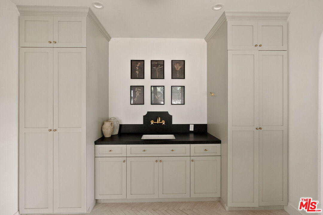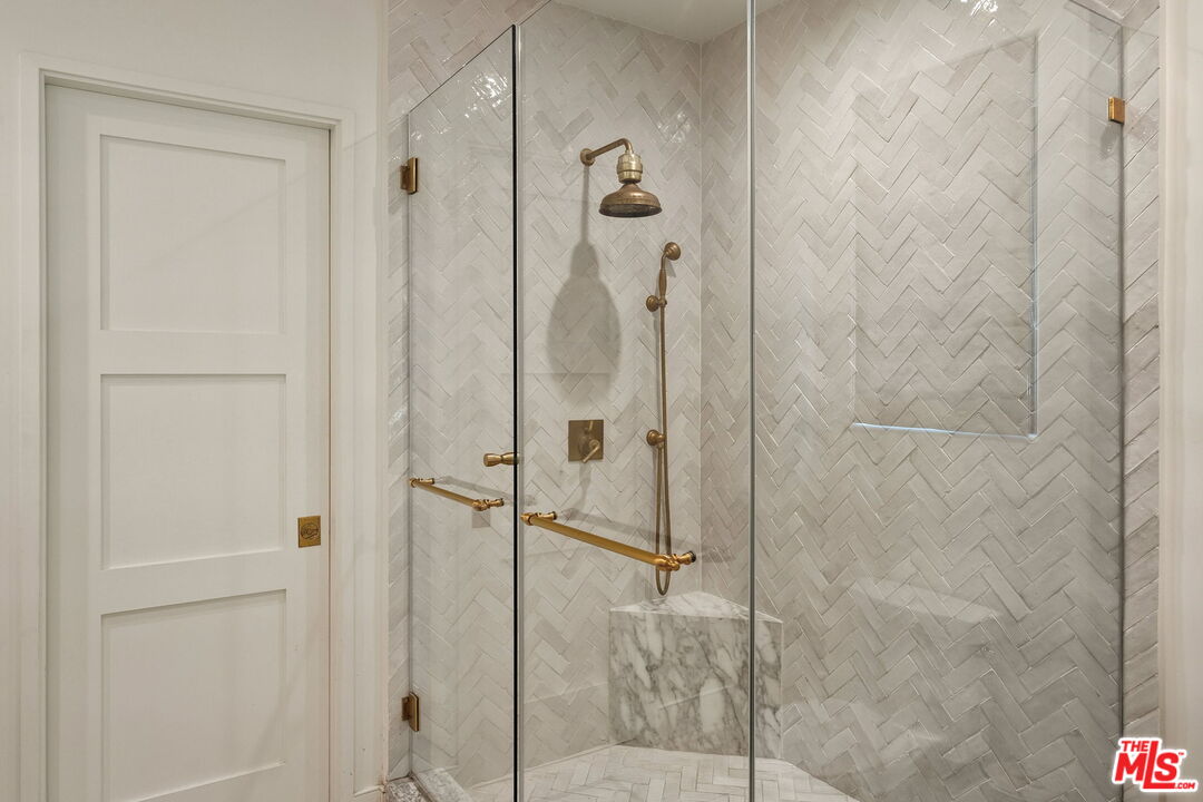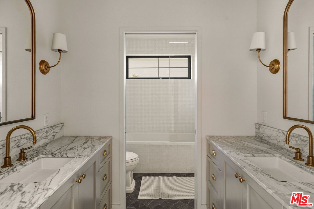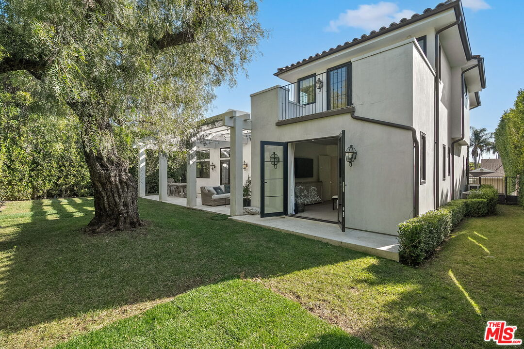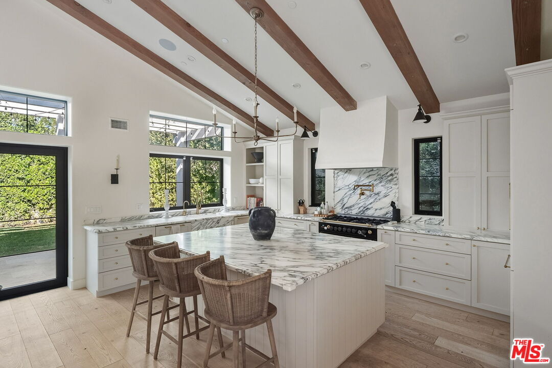 Nestled in Brentwood, this Spanish-style residence evokes timeless sophistication -- an architectural gem with interiors worthy of the pages of a design magazine. Classic rustic charm meets modern refinement throughout, with soaring beamed ceilings, wide plank oak floors, graceful archways, and an abundance of natural light streaming through oversized windows. A dramatic double-height entry sets the tone, opening to an expansive great room crowned with beams and framed by a wall of French doors that invite effortless indoor-outdoor living. Carefully curated lighting and integrated surround sound create an inviting ambiance to elevate every moment. The space flows seamlessly from the living area, anchored by a striking floor-to-ceiling fireplace, to a dining nook with built-in banquet seating and onward to the showpiece kitchen. The gourmet kitchen is as beautiful as it is functional, featuring natural stone surfaces, custom cabinetry, and gleaming brass fixtures that feel like jewelry. A substantial center island with bar seating serves as the heart of the home, while a premium ILVE double oven range with a custom hood brings culinary ambitions to life. Just down the hall, a versatile den offers possibilities for a variety of lifestyles, ideal for use as a home office, media lounge, gym, or playroom. The main-level primary suite is a serene retreat, opening through French doors to the lush backyard. Indulge in a spa-inspired en suite bath with dual stone-topped vanities, a glass-enclosed tiled shower, and a generous walk-in closet with custom organization. Upstairs, three spacious secondary bedrooms await, including two with private balconies. A beautifully appointed shared bath features dual vanities and a shower-tub combination. Outside, the fenced backyard lives like a private oasis, enclosed by mature hedging and offering a grass lawn alongside an expansive pergola-shaded patio for lounging, dining al fresco, or enjoying game-day gatherings. Additional highlights include a stylish powder room, a fully outfitted laundry room, and an attached two-car garage with direct home access. Supremely located with convenient access to the best of Brentwood's amenities and top-rated schools. Popular boutiques and renowned restaurants are just moments away in Brentwood Village and along San Vicente Blvd, while the beach is just a few minutes' drive. This exceptional residence embodies the romance of the Spanish-style with the ease of modern luxury in one of the Westside's most desirable neighborhoods.