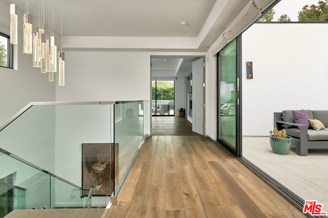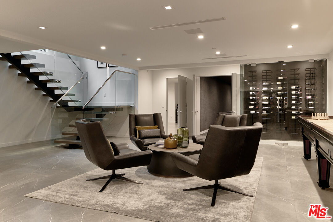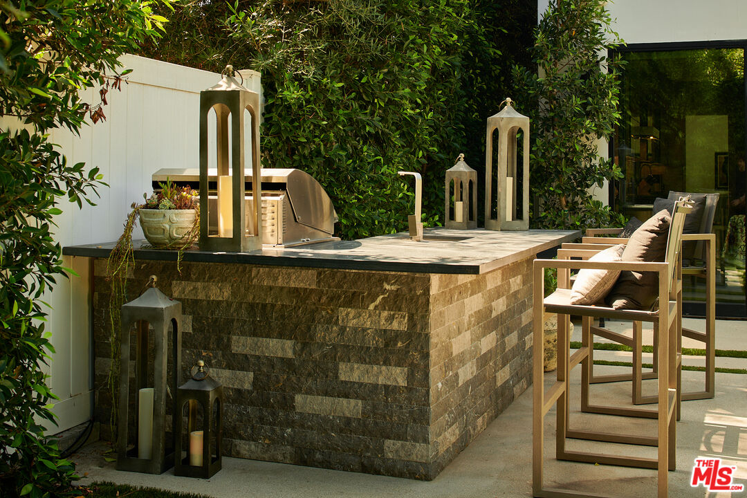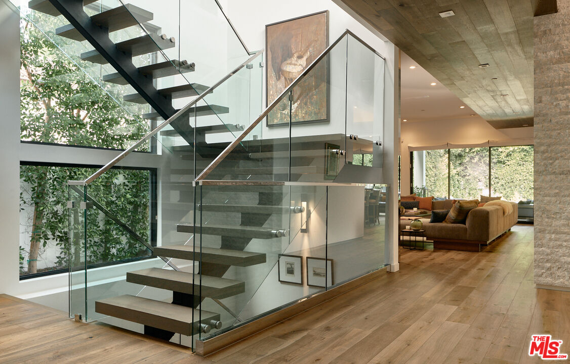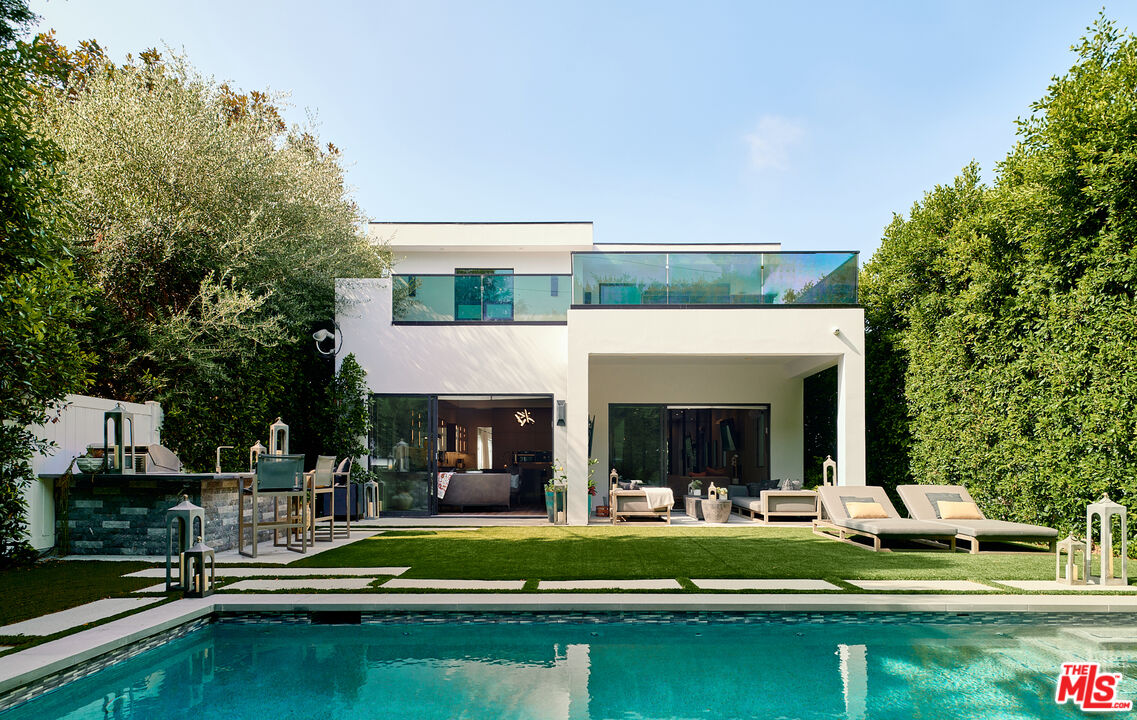 Ideally situated in prime Brentwood and thoughtfully tucked away, this newer-construction estate offers a rare blend of elegance, sophistication, and privacy, providing a serene setting that feels worlds apart despite its central location. A dramatic entry sets the stage for the 6-bedroom, 7-bath residence, where soaring ceilings, an abundance of natural light, and sleek lines are softened by carefully curated finishes. Designer-done throughout, the open-concept floor plan is both modern and inviting, framed by Fleetwood sliding doors that epitomize Southern California's seamless indoor-outdoor lifestyle. The gourmet chef's kitchen is masterfully appointed with Miele appliances and an oversized island, opening to a more intimate living area that flows effortlessly to the backyard. This private outdoor oasis is fully hedged and landscaped for complete seclusion, with a heated pool and spa surrounded by lush greenery, an idyllic retreat for entertaining or relaxation. A personal elevator services all three levels. Upstairs, three spacious en-suite bedrooms complement the primary retreat, a sanctuary featuring a fireplace, spa-like bath with soaking tub and steam shower, a custom walk-in closet, and an oversized private terrace overlooking the garden, perfect for morning coffee or evening sunsets. The lower level is designed for elevated living and entertainment, complete with a state-of-the-art home theater, wine closet, full bar, and gym. Meticulously built and thoughtfully styled, this residence embodies the best of both worlds: dramatic modern design, warmed by elegant details, and private, peaceful living just moments from the Brentwood Country Mart, fine dining, boutique shopping, and all the Westside has to offer.