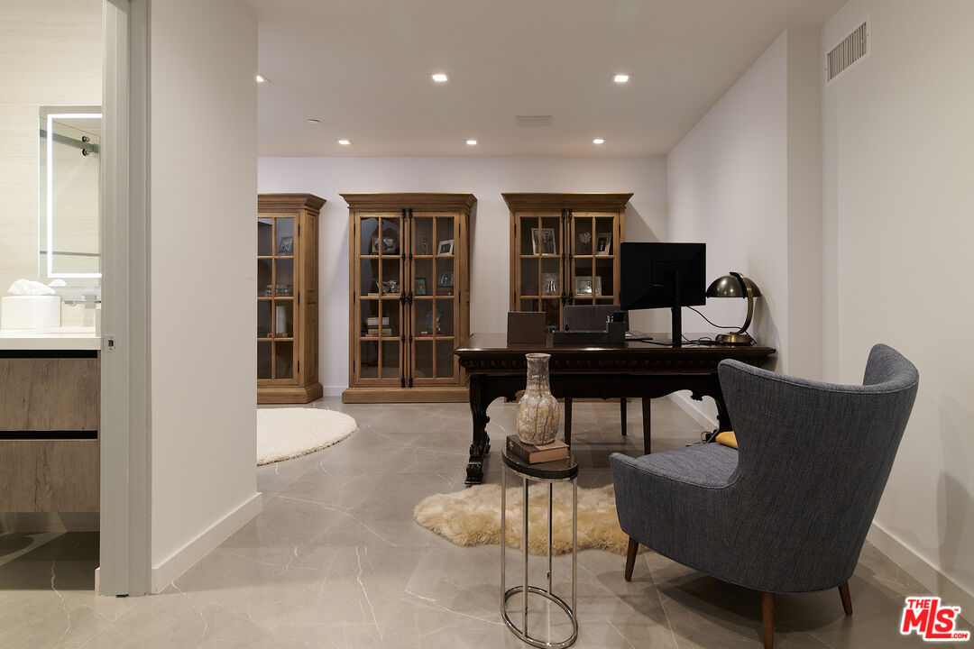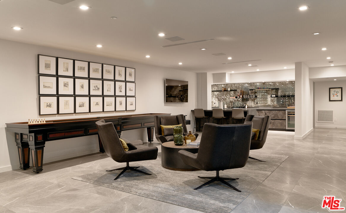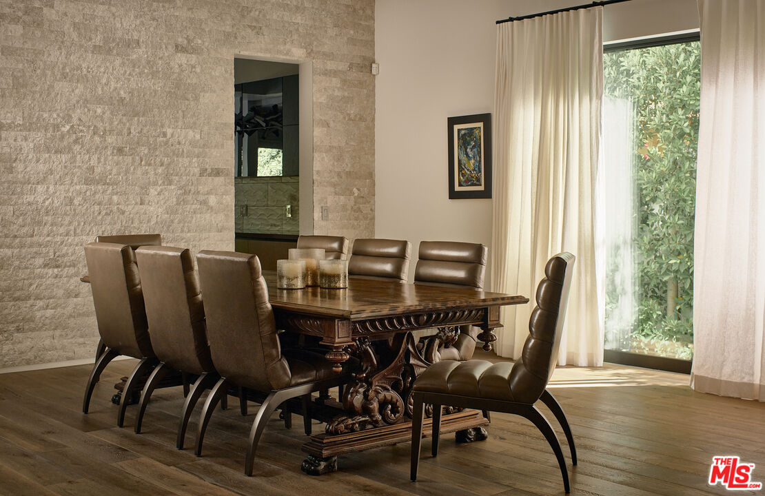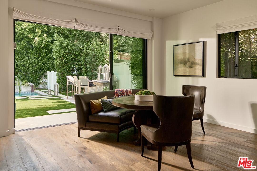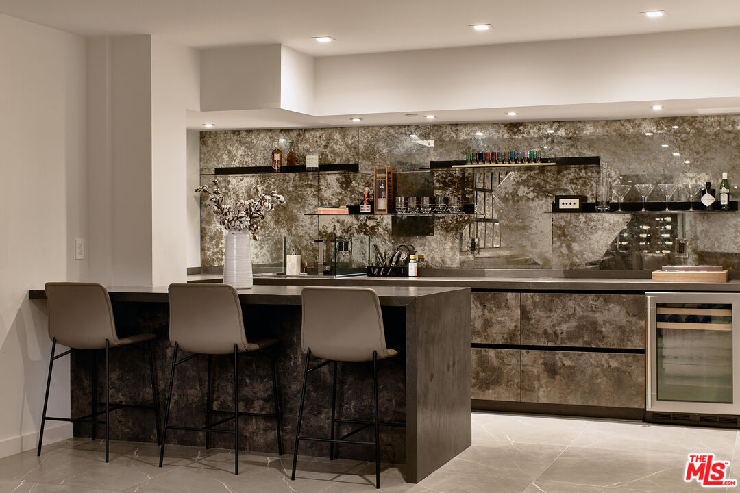 Ideally situated in prime Brentwood and thoughtfully tucked away, this newer-construction estate offers a rare blend of elegance, sophistication, and privacy, providing a serene setting that feels worlds apart despite its central location. A dramatic entry sets the stage for the 6-bedroom, 7-bath residence, where soaring ceilings, an abundance of natural light, and sleek lines are softened by carefully curated finishes. Designer-done throughout, the open-concept floor plan is both modern and inviting, framed by Fleetwood sliding doors that epitomize Southern California's seamless indoor-outdoor lifestyle. The gourmet chef's kitchen is masterfully appointed with Miele appliances and an oversized island, opening to a more intimate living area that flows effortlessly to the backyard. This private outdoor oasis is fully hedged and landscaped for complete seclusion, with a heated pool and spa surrounded by lush greenery, an idyllic retreat for entertaining or relaxation. A personal elevator services all three levels. Upstairs, three spacious en-suite bedrooms complement the primary retreat, a sanctuary featuring a fireplace, spa-like bath with soaking tub and steam shower, a custom walk-in closet, and an oversized private terrace overlooking the garden, perfect for morning coffee or evening sunsets. The lower level is designed for elevated living and entertainment, complete with a state-of-the-art home theater, wine closet, full bar, and gym. Meticulously built and thoughtfully styled, this residence embodies the best of both worlds: dramatic modern design, warmed by elegant details, and private, peaceful living just moments from the Brentwood Country Mart, fine dining, boutique shopping, and all the Westside has to offer.