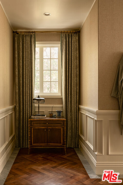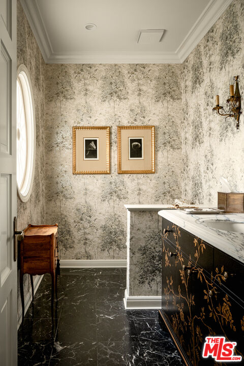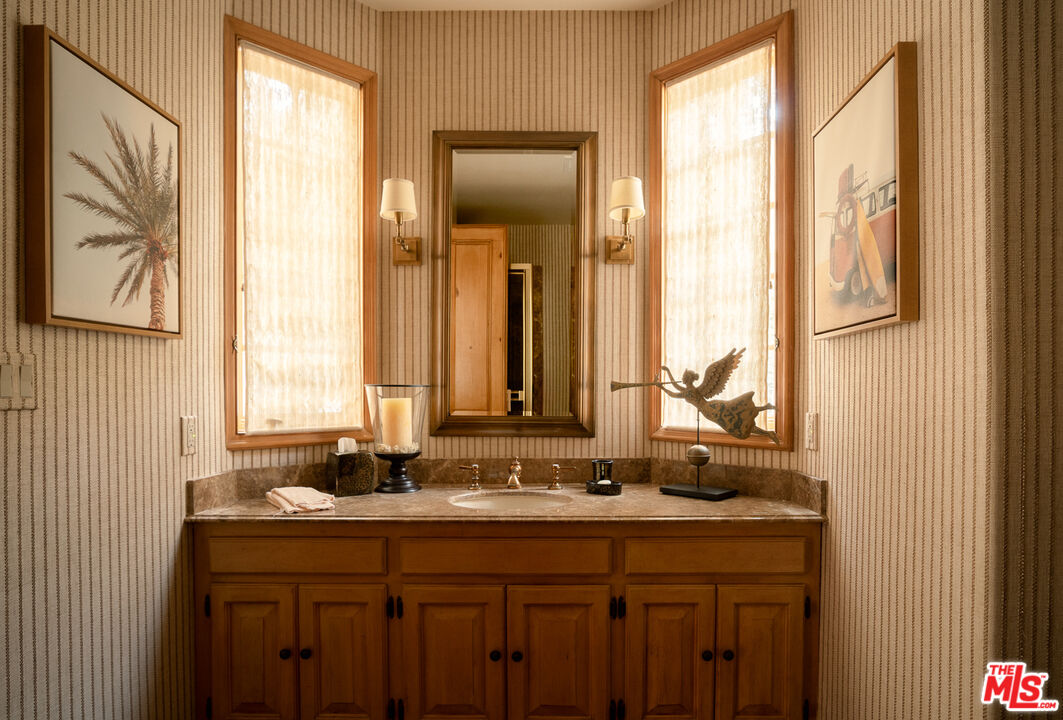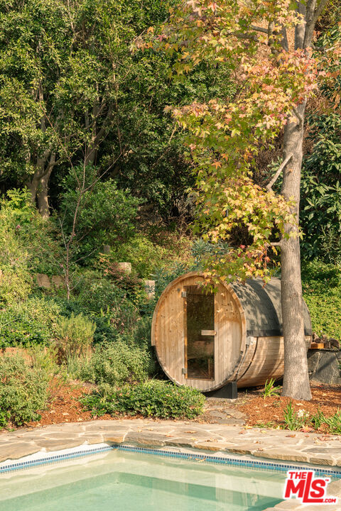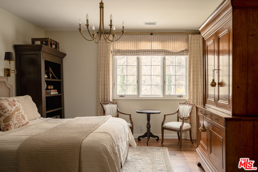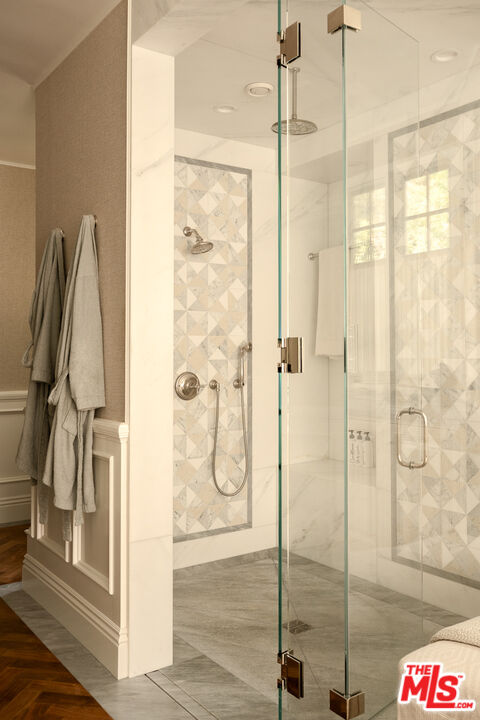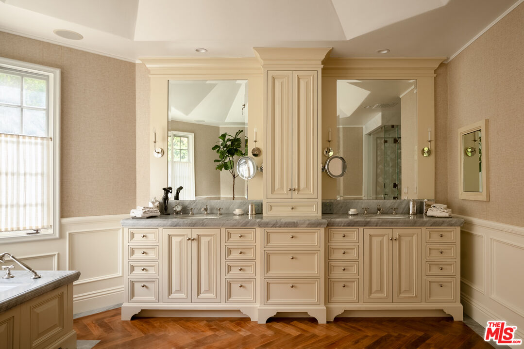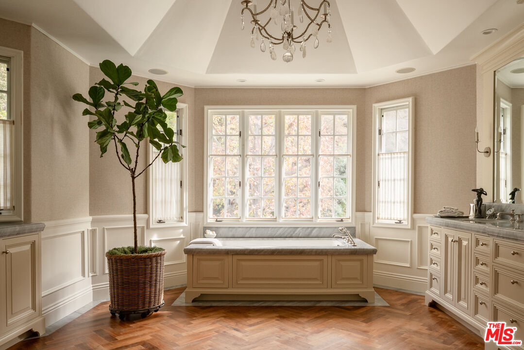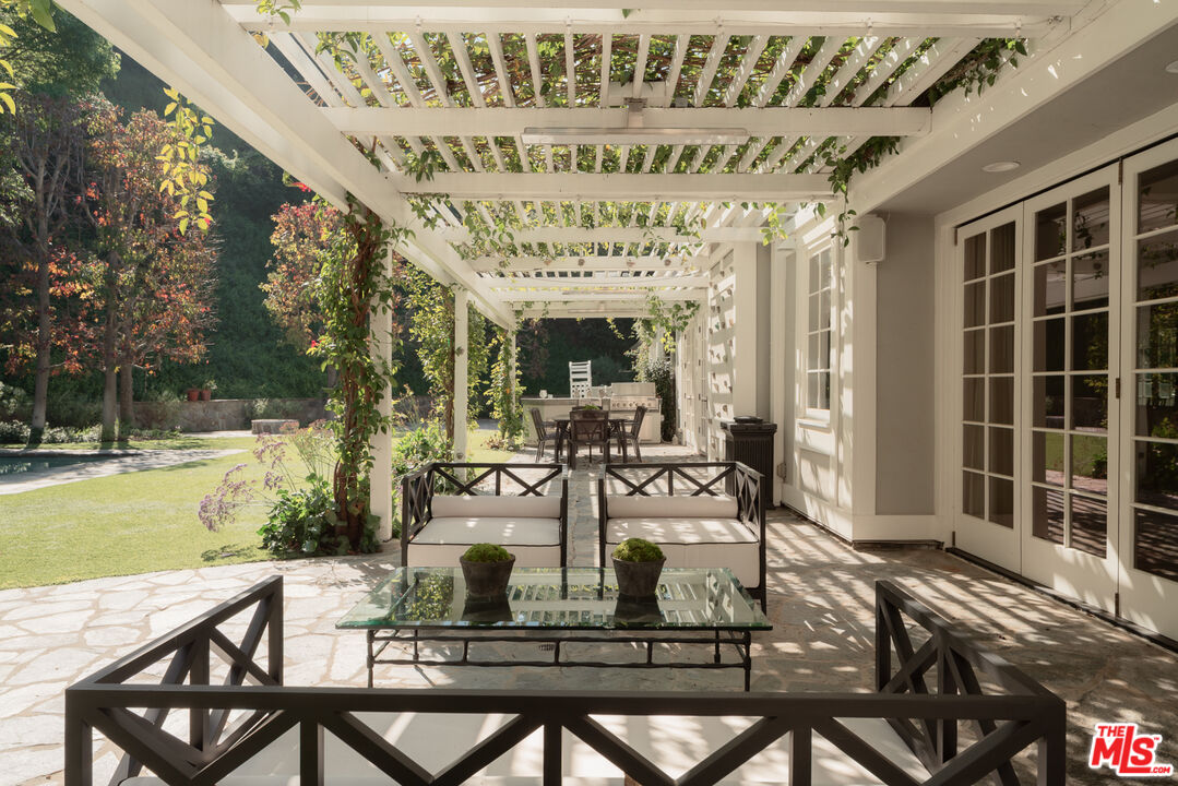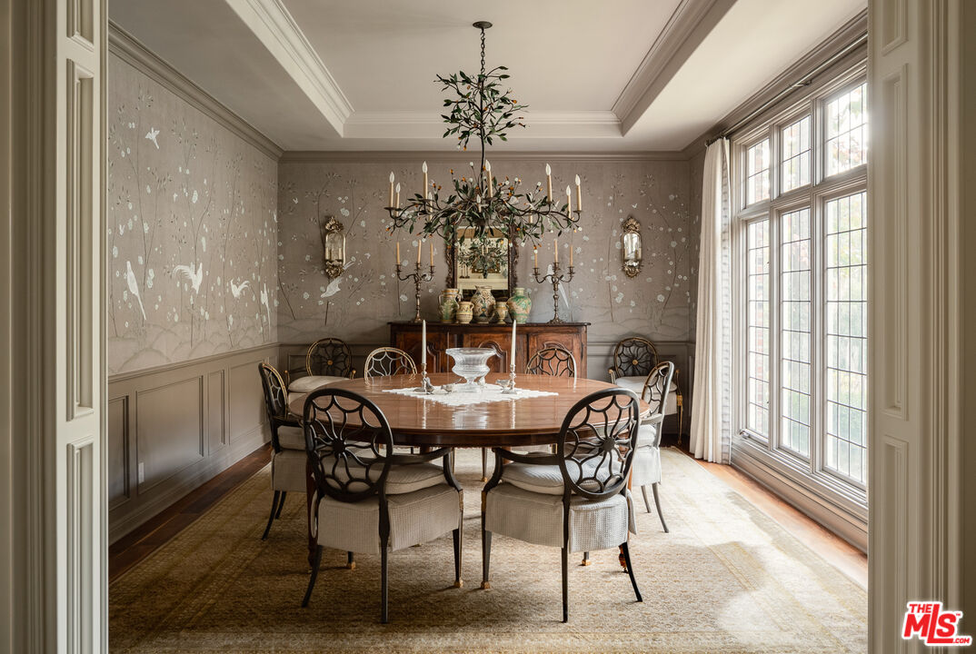 One of the most significant homes within the exclusive gates of Moraga Estates, among just 38 residences in this coveted Bel Air enclave. Discreetly set behind an expansive, tree-lined frontage stretching nearly 600 feet, the stately Tudor residence is surrounded by rolling hillside views, its classic brick facade softened by curated landscaping and a canopy of mature sycamores. Original parquet in the foyer with added custom walnut floors throughout and thick doors with hand-forged hardware anchor the interiors in material richness. The formal dining room is wrapped in hand-painted wallpaper with tall leaded-glass windows lining the room, drawing in soft natural light and framing tranquil views of the surrounding greenery. The chef's kitchen features Wolf appliances, a farmhouse sink, a large island, and an adjacent pantry includes a second refrigerator, a wine refrigerator, and large-capacity freezer. The kitchen dining area has a concealed pop-up television and access through three French doors that open to a trellised patio with Barbeque area. Nearby, a built-in bar with additional beverage, wine and ice machine. A separate wood-paneled library offers a quiet retreat with a large fireplace, custom built-ins, and an ensuite bath, making it ideal as an office or guest suite. One of the home's most artful vignettes, the powder room is wrapped in ethereal, painterly wallpaper and grounded by striking black marble flooring. An oval window with a radial grille casts soft, diffused light across the space, illuminating a hand-carved antique vanity and custom marble sink. The primary suite opens to a private terrace with sweeping hillside views often visited by deer. The bathroom evokes the feeling of a treehouse spa with large windows, dual vanities with filtered water, dual toilet closets with Toto Washlets, a seven-foot soaking tub, and a multi-head rain shower. Chevron-patterned walnut and marble floor and ambient lighting add a sense of calm and continuity. Double dressing rooms include custom cabinetry and built-in safes. The guest wing includes three generously sized bedrooms with ensuite baths and walk-in closets. Along the hallway there's additional storage with three walk-in closets and two linen cabinets. Further down the hallway is a family lounge and a large bonus room that currently serves as a music studio. An additional guest bedroom, walk-in closet and bath is down the backstairs. Outside, a vine-draped pergola runs the full length of the home, strung with twinkle lights and warmed by built-in heaters. The grounds feature a large pool and spa, Swedish sauna, herb garden, firepit with lounge seating, a separate pool bathroom with shower, climbing wall, gymnastics rings, yoga sling, and Rogue stall bars. A fully equipped outdoor kitchen and dining area enhance the experience. The stone driveway leads to a gated portico and an expansive motor court with access to the climate-controlled three-car garage. Security is paramount on Moraga Drive. The community security features 24-hour gated guard service, roving patrol vehicles, and a self-launching drone with infrared technology, making Moraga one of the most advanced residential surveillance systems in the country.