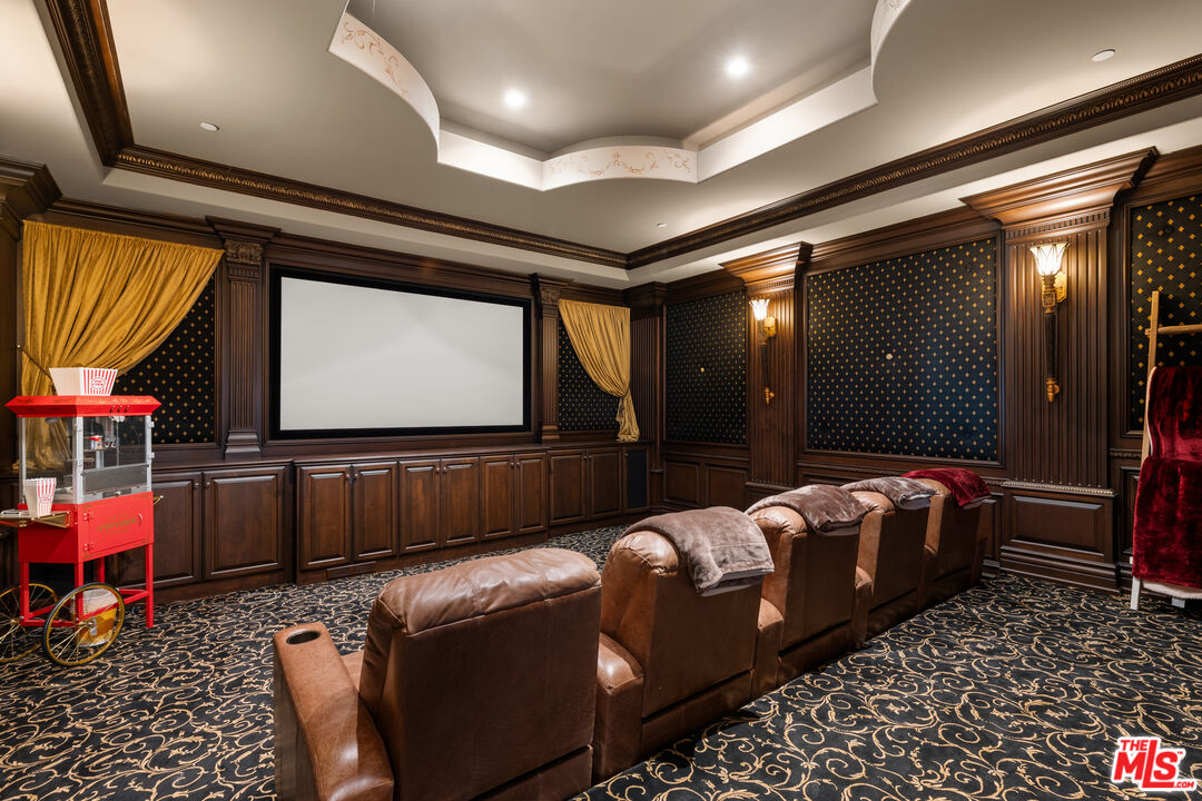 Behind the coveted secondary gates of The Estates at The Oaks, this exceptional custom residence offers unmatched privacy, sweeping mountain and canyon views, and a rare opportunity to own one of Calabasas' premier properties. Set on an expansive, beautifully landscaped lot, the home blends timeless design with resort-style amenities throughout. A grand double-height foyer introduces a warm, open layout ideal for both everyday living and elevated entertaining. The main level features formal living and dining rooms, a lounge wing with game room, full bar, and a private theater, along with a chef's kitchen anchored by Viking appliances, a large island, and a cozy fireplace.Upstairs, the serene primary retreat enjoys a fireplace, large walk-in closet, spa-inspired bath, and a private balcony framing spectacular view lines. Outside, the estate transforms into a true private compound complete with a beach-entry pool and spa, generous grassy areas, a putting green, sports court, two outdoor fireplaces, fire pit, and a full barbecue pavilion with smoker and pizza oven. Additional amenities include a 1,000-bottle temperature-controlled wine room, gym with massage space, elevator, and a climate-controlled, fireproof 8-car garage perfect for collectors.
