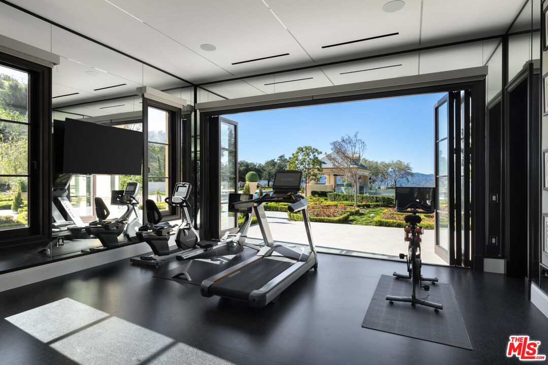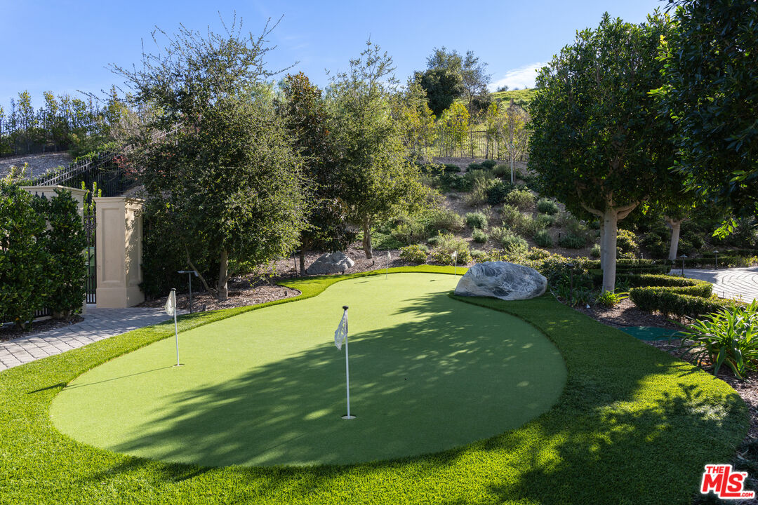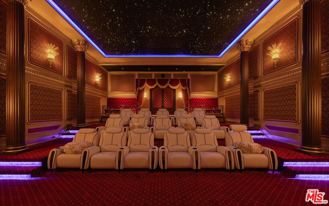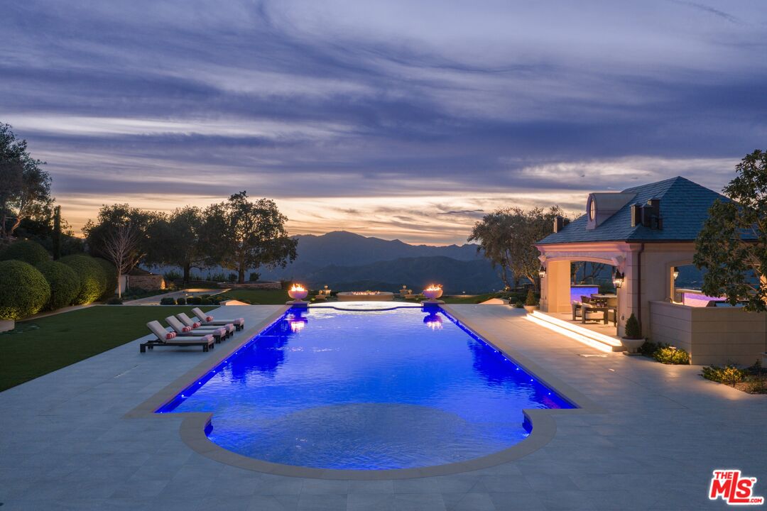 Behind the double gates of The Estates at The Oaks, this majestic residence offers rare privacy and sweeping, unobstructed views across the rolling hills of Malibu. Set at the end of a long, quiet driveway, and spanning over two acres, the property evokes a European country estate, thoughtfully built over more than a decade with exceptional care and intention. Traditional craftsmanship is showcased through hand-selected stone, custom wall treatments, intricate moldings, and layered tile work, with bespoke wallpaper, paneling, and millwork sourced from JP Weaver Company. The architecture feels timeless yet current, anchored by a grand arrival court with a scaled stone fountain and an entry aligned perfectly with the horizon. Inside, soaring domed ceilings, wide hallways, and sweeping bronze staircases frame endless vistas and create a striking sense of arrival. The main level unfolds through a seamless blend of formal and informal spaces. A monumental entry leads to an elegant lounge with a Spanish limestone fireplace opening to the gardens, while a Louis XIV inspired dining room with custom French wall coverings overlooks the grounds. The chef's kitchen flows into the family room, bar, and fireside gathering areas, finished with refined European details and a full suite of Miele and Wolf appliances. Dual library offices with concealed bath and Minotti cabinetry, a vaulted game room opening to outdoor entertaining areas, three guest suites with outdoor access, and a glass-wrapped gym with steam room and massage suite complete the level. Wraparound terraces extend the living spaces outdoors, ideal for both entertaining and quiet retreat. Upstairs, five bedroom suites surround a grand landing, including an exceptional primary suite with vaulted ceilings, a private living room, domed office, dual spa-caliber bathrooms, expansive closets, and a sweeping terrace with outdoor fireplace overlooking Malibu State Park. A secondary primary offers similar scale with its own foyer, stone fireplace, soaking tub, and private terrace. The lower level features a 5,225 sq. ft. air-conditioned garage, a French-inspired cinema with fiber-optic ceiling and Dolby Atmos sound, an entertaining lounge with bar, wine cellar and tasting room, and a private beauty salon. The grounds unfold as a series of curated experiences, including tennis, pickleball, and bocce courts, a solar-heated ozone pool, dramatic fire pits, and a fully equipped outdoor pavilion with dual BBQs, pizza oven, bar, and integrated bathrooms. A vegetable garden adds a quieter rhythm to the property. Above it all, an elevator-accessed rooftop deck offers uninterrupted 360-degree views across the entire community. The estate is engineered for longevity and sustainability with advanced HVAC, whole-home water purification, solar power, fire-resistant construction, a full backup generator, and a triple-phase electrical system guided by Vastu and feng shui principles for balance and clarity.