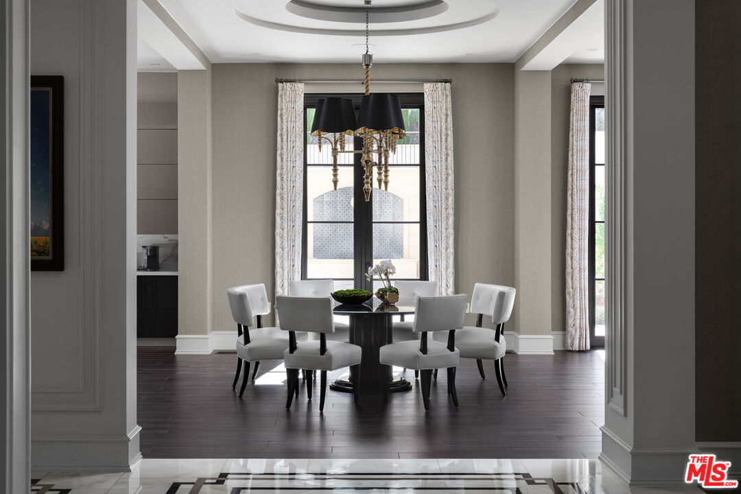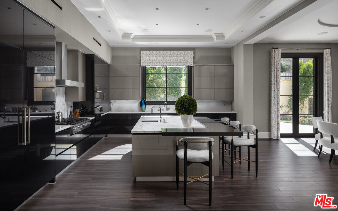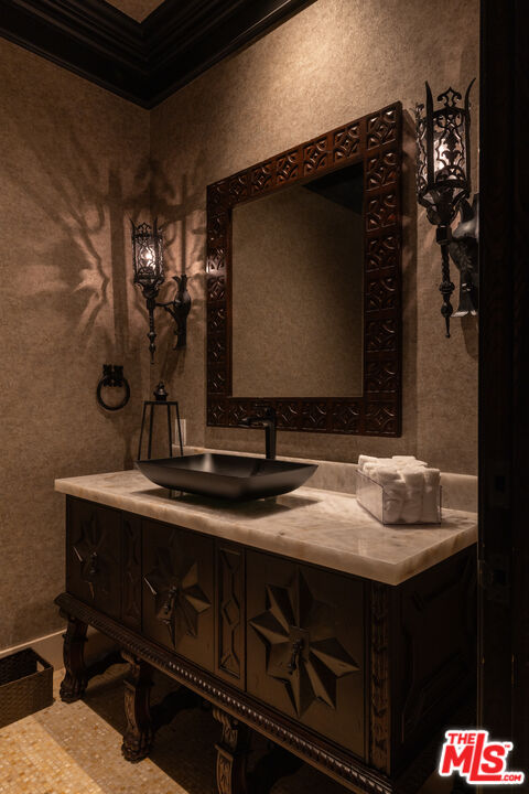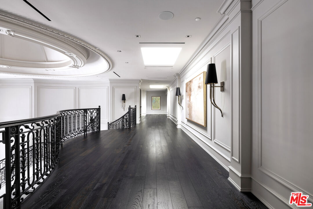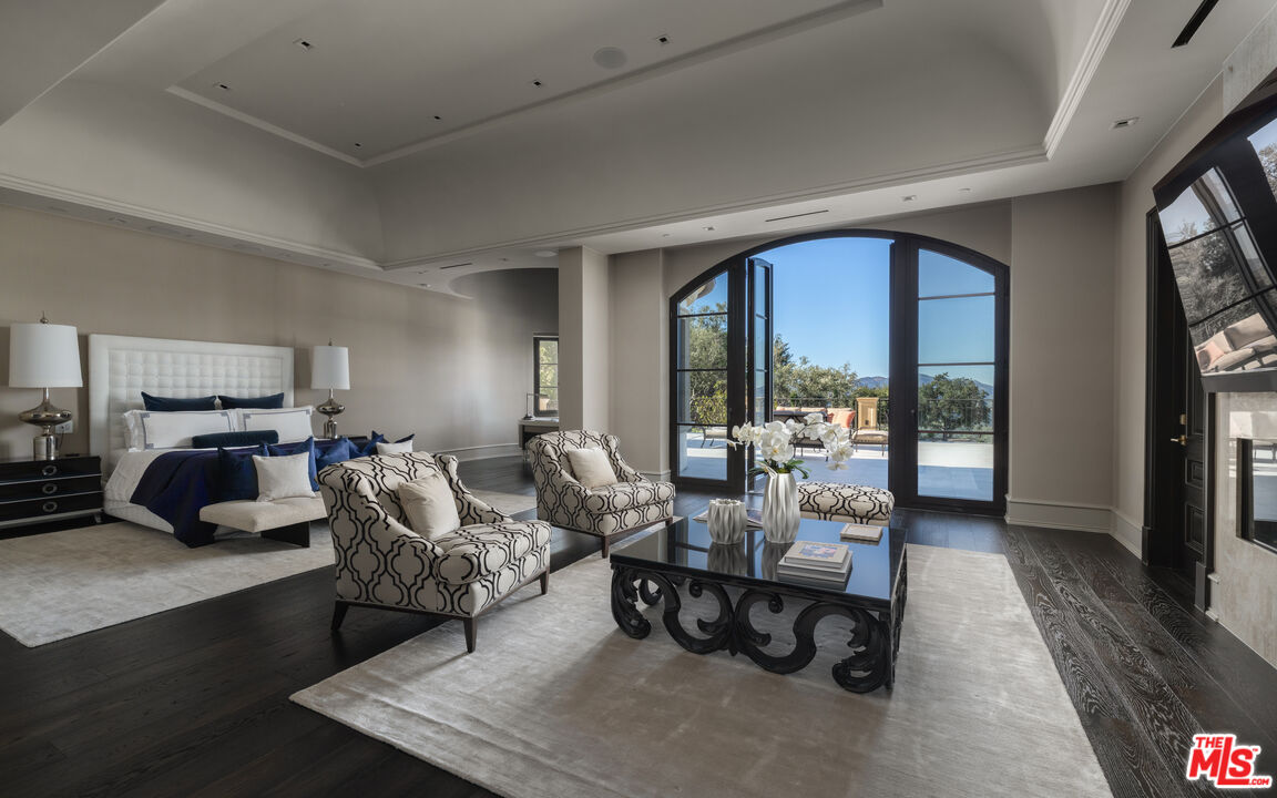 Behind the double gates of The Estates at The Oaks, this majestic residence offers rare privacy and sweeping, unobstructed views across the rolling hills of Malibu. Set at the end of a long, quiet driveway, and spanning over two acres, the property evokes a European country estate, thoughtfully built over more than a decade with exceptional care and intention. Traditional craftsmanship is showcased through hand-selected stone, custom wall treatments, intricate moldings, and layered tile work, with bespoke wallpaper, paneling, and millwork sourced from JP Weaver Company. The architecture feels timeless yet current, anchored by a grand arrival court with a scaled stone fountain and an entry aligned perfectly with the horizon. Inside, soaring domed ceilings, wide hallways, and sweeping bronze staircases frame endless vistas and create a striking sense of arrival. The main level unfolds through a seamless blend of formal and informal spaces. A monumental entry leads to an elegant lounge with a Spanish limestone fireplace opening to the gardens, while a Louis XIV inspired dining room with custom French wall coverings overlooks the grounds. The chef's kitchen flows into the family room, bar, and fireside gathering areas, finished with refined European details and a full suite of Miele and Wolf appliances. Dual library offices with concealed bath and Minotti cabinetry, a vaulted game room opening to outdoor entertaining areas, three guest suites with outdoor access, and a glass-wrapped gym with steam room and massage suite complete the level. Wraparound terraces extend the living spaces outdoors, ideal for both entertaining and quiet retreat. Upstairs, five bedroom suites surround a grand landing, including an exceptional primary suite with vaulted ceilings, a private living room, domed office, dual spa-caliber bathrooms, expansive closets, and a sweeping terrace with outdoor fireplace overlooking Malibu State Park. A secondary primary offers similar scale with its own foyer, stone fireplace, soaking tub, and private terrace. The lower level features a 5,225 sq. ft. air-conditioned garage, a French-inspired cinema with fiber-optic ceiling and Dolby Atmos sound, an entertaining lounge with bar, wine cellar and tasting room, and a private beauty salon. The grounds unfold as a series of curated experiences, including tennis, pickleball, and bocce courts, a solar-heated ozone pool, dramatic fire pits, and a fully equipped outdoor pavilion with dual BBQs, pizza oven, bar, and integrated bathrooms. A vegetable garden adds a quieter rhythm to the property. Above it all, an elevator-accessed rooftop deck offers uninterrupted 360-degree views across the entire community. The estate is engineered for longevity and sustainability with advanced HVAC, whole-home water purification, solar power, fire-resistant construction, a full backup generator, and a triple-phase electrical system guided by Vastu and feng shui principles for balance and clarity.