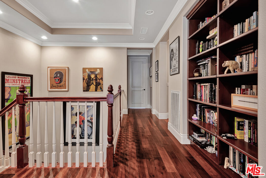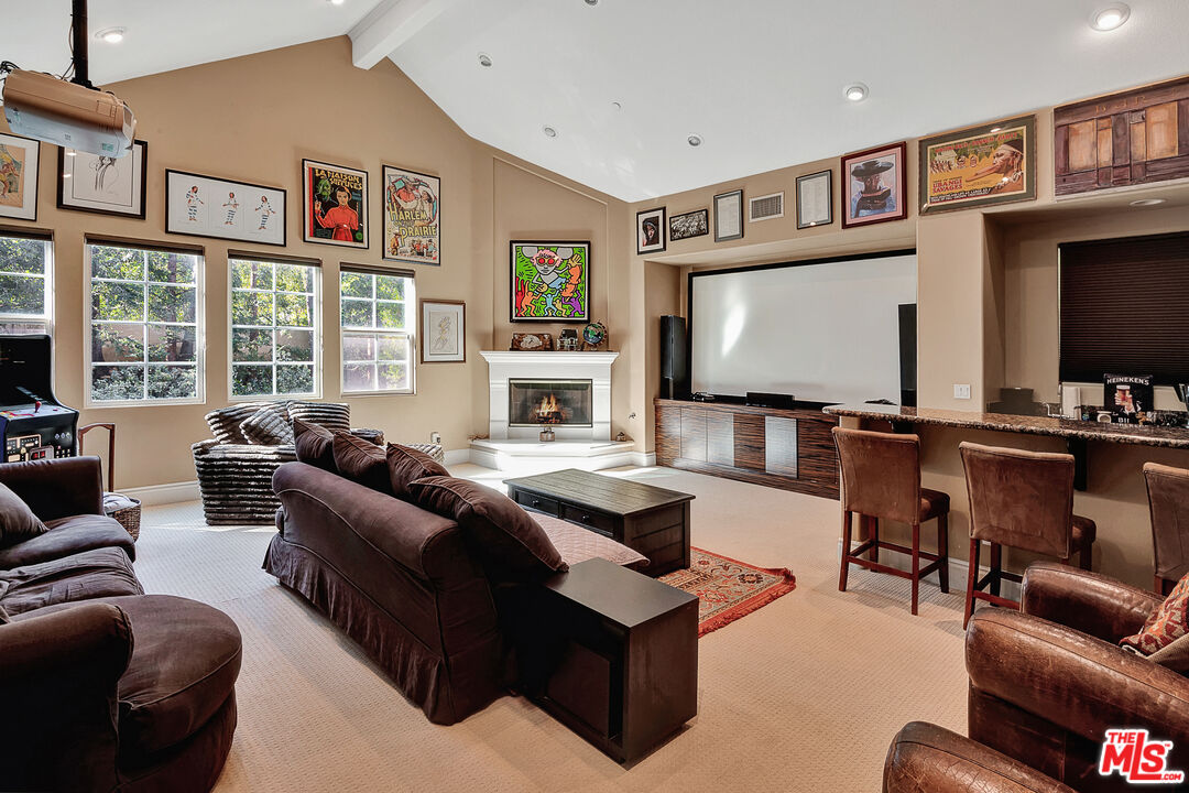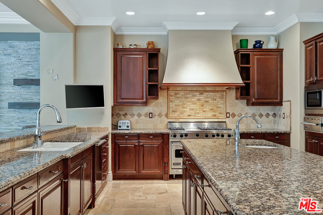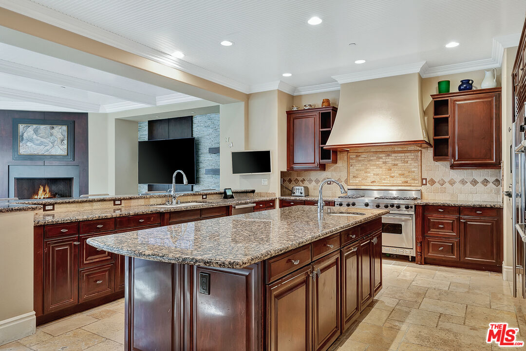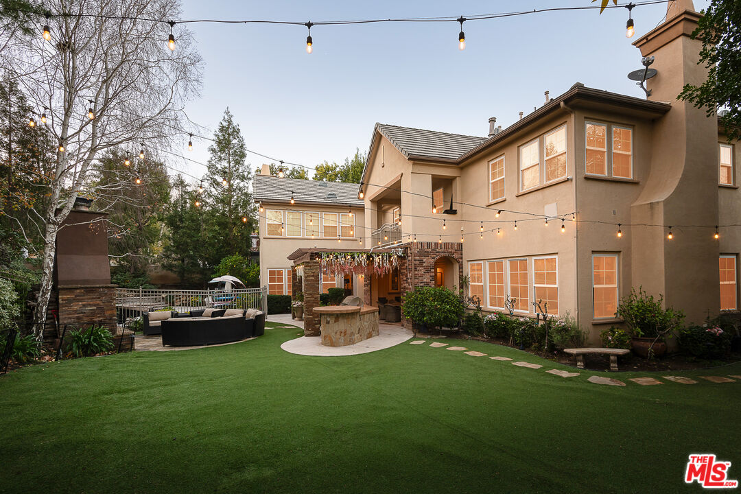 Tucked behind the prestigious guard-gated enclave of Mont Calabasas, this exceptional corner-lot estate offers an extraordinary blend of elegance, comfort, and rare privacy. Set apart with expansive frontage and beautifully mature landscaping, the residence exudes a classic traditional charm that is both warm and inviting from the moment you arrive. Thoughtfully designed for both sophisticated entertaining and everyday living, the home showcases a gracious floor plan filled with natural light and impeccable craftsmanship. At its heart is a stunning chef's kitchen, anchored by a generous center island and outfitted with premium Viking stainless-steel appliances. Seamlessly open to the inviting family room, this space features a richly detailed coffered ceiling and a welcoming fireplace creating the perfect setting for gatherings of any size. An impressive bonus/game room with its own fireplace and wet bar provides a versatile retreat for recreation and relaxation, while a dedicated home gym offers an ideal space for wellness and fitness. Six beautifully appointed bedrooms include a luxurious primary suite complete with a private balcony, intimate sitting retreat, spa-inspired all-stone bath, and dual custom walk-in closets, an indulgent sanctuary to begin and end each day. Refined interior finishes elevate the home throughout, including gleaming hardwood floors, elegant crown moldings, custom window treatments, beadboard ceilings, and dual staircases that enhance both form and function. The resort-style backyard is a private oasis designed for year-round enjoyment. A sparkling pool and spa with tranquil waterfall serve as the centerpiece, complemented by a covered patio with built-in barbecue center, a charming freestanding stacked-stone fireplace, and a spacious play area. Surrounded by lush, mature trees and meticulously curated landscaping, the grounds provide an unparalleled sense of seclusion and serenity rarely found in today's market. This is more than a home, it is a beautifully crafted lifestyle opportunity in one of Calabasas' most sought-after communities.