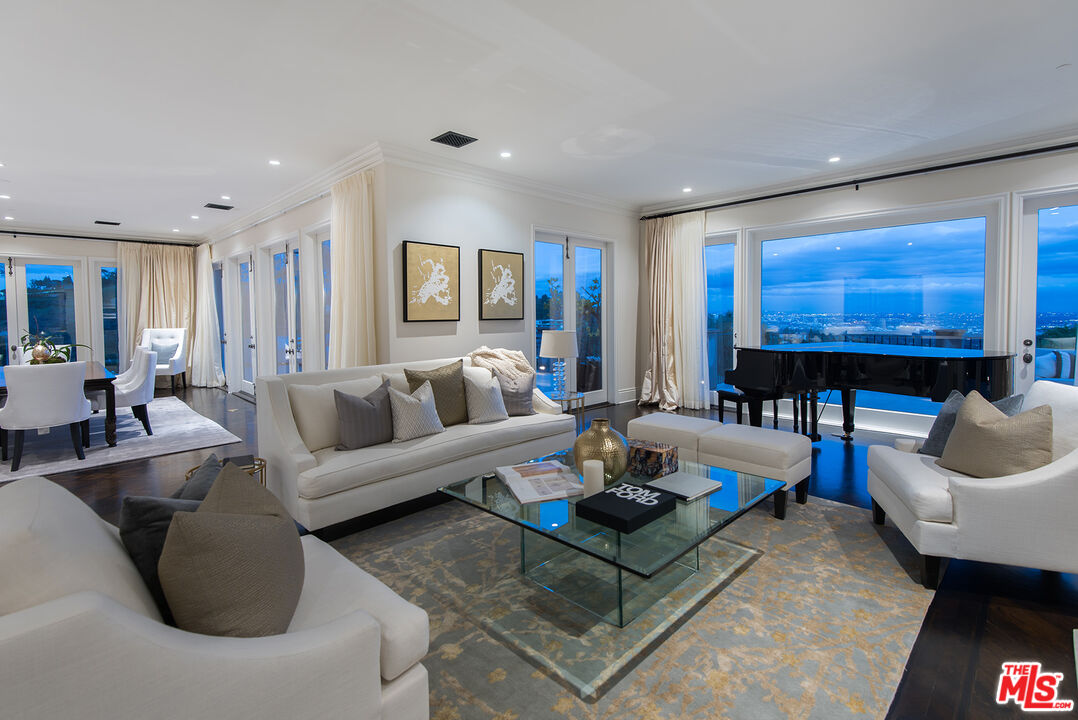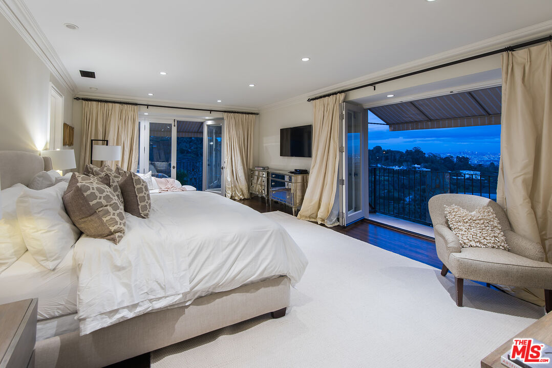 This gated French Country Maison offers 4 bedrooms, 2 staff quarters, 9 baths and gorgeous city views. A long private driveway framed by mature olive trees, white roses & lavender leads to a large motor court. 2-story entry, library, coffered ceilings, and French doors overlook the courtyard. Formal living rm w/views from downtown to Century City on approximately 2 acres. California indoor/outdoor lifestyle w/spacious dining room, gourmet chef's kitchen & breakfast area w/ family room. Lovely verandas, terraces, outdoor BBQ w/fireplace, salt water pool and a pergola. The luxurious primary suite has 2 separate baths & 2 walk-in closets. Open media room, game room, service kitchen, N/S championship Tennis Court, gym, sauna & attached 3-car garage. Furnished only.
