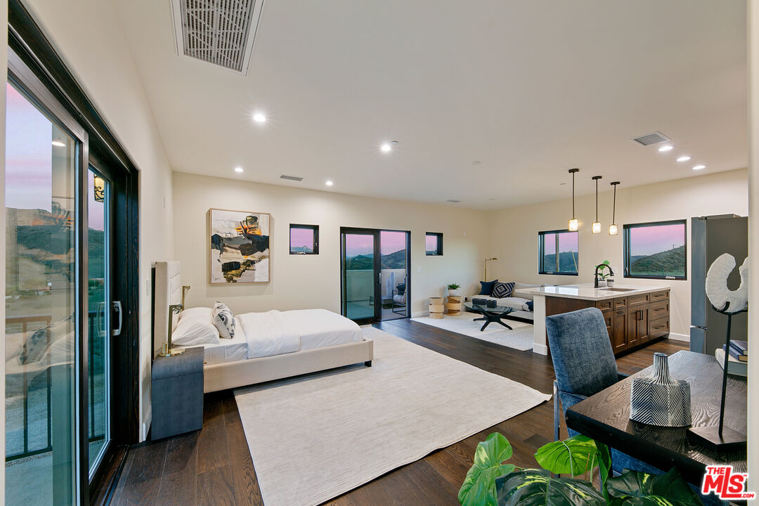 Just completed, this exceptional private estate spans approximately 20 acres, perfectly situated below the magical Boney Ridge in coveted West Malibu. Surrounded by nature and offering complete privacy, the property showcases breathtaking ocean, sunset, and Channel Islands views. The main residence features five bedrooms and four full baths, thoughtfully designed with vaulted ceilings and an expansive living area that flows seamlessly to the outdoors. Walls of glass open to an ocean-view infinity-edge pool and spa, creating a stunning indoor-outdoor lifestyle with multiple areas for entertaining and relaxation. The primary suite is a true retreat, highlighted by a fireplace and a luxurious spa-inspired bath. A fifth bedroom suite, complete with its own private entrance and kitchen, offers flexibility as a guest house or private living quarters. The estate also includes two separate buildable pads with re-approval permits in the final stages. One pad is planned for a fully independent guest house featuring two bedrooms and a two-car garage. The second pad is designed for a barn or car barn, with all utilities conveniently run underground. This rare offering combines new construction, expansive land, panoramic views, and total seclusion in one of Malibu's most enchanting locations. A truly magical estate must be seen to be appreciated.