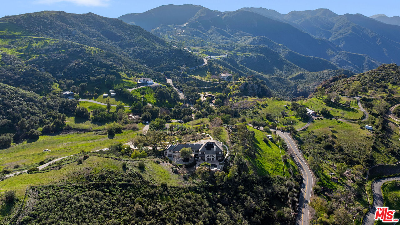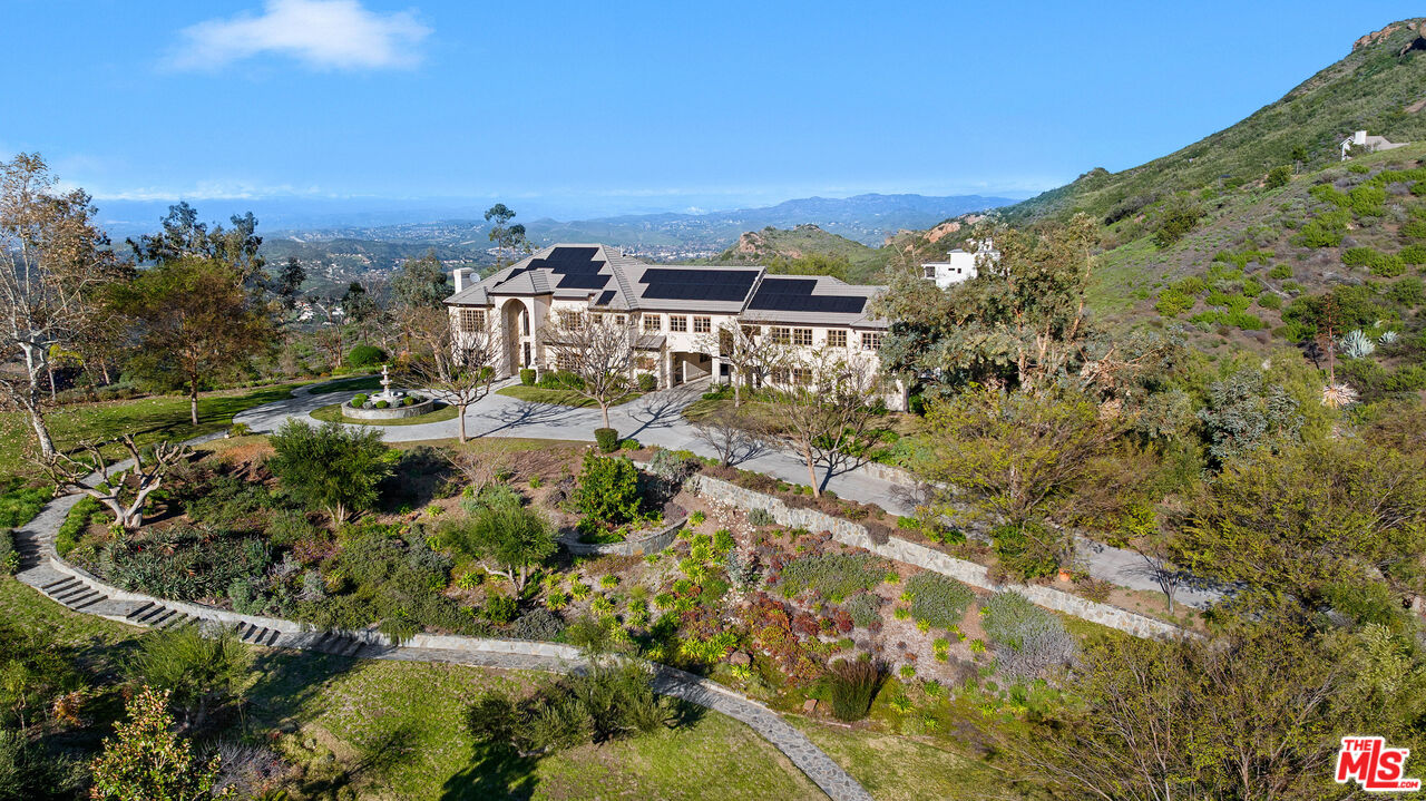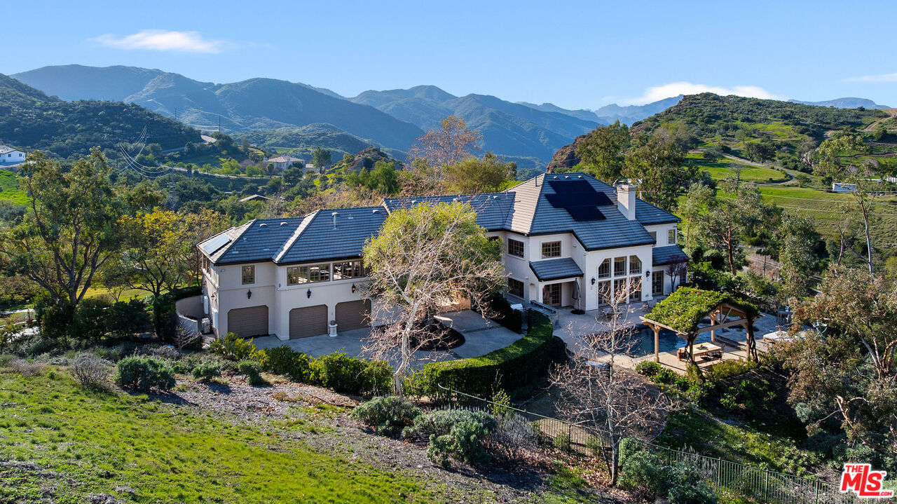 Tucked into the Malibu mountains just minutes from Agoura and Westlake Village, this exceptional estate offers a rare blend of privacy, space, and natural beauty across 4.5 acres. Soaring ceilings and a grand staircase create a striking entry, while multiple fireplaces add warmth throughout. The open kitchen flows into the main living areas and formal dining room, well suited for everyday living and entertaining. The primary suite is its own private wing with a spa-like bath, soaking tub, and peaceful mountain views. Enjoy sweeping vistas from the pool and spa, with multiple outdoor areas designed for easy indoor-outdoor living. The lush landscaping and fully enclosed garden provide a private, serene outdoor retreat. The expansive lot offers exceptional privacy, ample parking, a three-car garage, solar panels, peace and privacy. Welcome to your own exclusive estate.