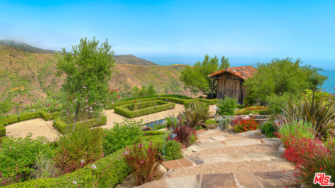 Tucked away behind gates atop the Malibu hills, this enchanting estate captures panoramic ocean and mountain views while evoking the timeless romance of a European countryside retreat. The approach unfolds along a long drive into a broad motor court with parking for 10+ cars, framed by lush gardens and anchored by a stone fountain.Inside, soaring wood-beamed ceilings, French doors, and gallery walls create a backdrop of warmth and elegance. The main living room is crowned by a monumental fireplace and flows to a formal dining room and chef's kitchen, where custom cabinetry, a walk-in pantry, dual ovens, a Viking range, Wolf six-burner cooktop, and a large stone-topped island cater to both intimate evenings and grand entertaining. Nearly every room opens to patios, gardens, or terraces, merging the indoors with the property's dramatic natural setting.The estate is designed with multiple wings for privacy. The primary suite features vaulted ceilings, a stone fireplace, and walls of glass that frame ocean and pool views. Its spa-inspired bath offers dual vanities, a soaking tub, and a large shower with multiple heads. Additional bedroom suites include private patios and marble-clad bathrooms, while a powder room delights with hand-painted lemon grove murals and a sculptural wood vanity. Beyond the main house, a detached office with vaulted ceilings, stone fireplace, reclaimed wood built-ins, and a wet bar creates the perfect studio or guest space. Across the court, a guest suite adjoins the garages, complete with wood floors, vaulted ceilings, en-suite bath, and French doors to a pergola-shaded patio. The outdoor living is extraordinary: a covered loggia with stone fireplace, alfresco dining, and heaters for year-round enjoyment; expansive lawns flowing to a long rectangular pool and spa with automatic cover; and terraced gardens with citrus groves, fountains, koi ponds, and box hedges. Meandering stone paths lead to a barn-inspired guest structure with a porch swing and firepit seating, all overlooking breathtaking ocean and canyon vistas. A professional-grade recording studio with soaring ceilings, custom acoustics, and a sound room enhances the estate's versatility, offering creative refuge for artists and visionaries. Throughout the property, hidden seating areas, romantic pergolas, and layered gardens create a sense of discovery and retreat. Exquisitely landscaped and thoughtfully designed, 2900 Corral Canyon Rd is a rare Malibu estate that combines European elegance, coastal serenity, and boundless possibilities for living, entertaining, and creating.