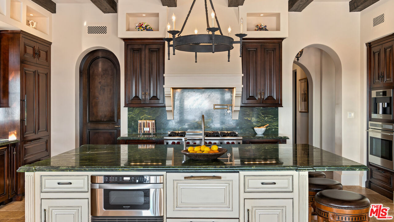 Enter through a grand metal, glass, and wood front door framed by a stone doorway, where breathtaking ocean views immediately greet you. The foyer boasts soaring wood-beamed ceilings and a chandelier, setting the tone for refined elegance. To the right, the formal dining room features high wood-beamed ceilings, arched entryways, and a butler's pantry. Steps lead down to the Main Gallery, lined with barrel ceiling arches and light fixtures. The chef's kitchen is designed for both beauty and functionality, featuring an oversized island with bar seating, stone counters, and wood-beamed ceilings. Premium Wolf appliances, including a double oven stove, additional wall oven, six-burner range, pot filler, and hood fan, complete the space. A Subzero fridge, freezer, and refrigeration drawers provide ample storage. Adjacent, an ocean-view breakfast nook offers stunning pool and coastline vistas. The Family Room includes two sets of French doors opening to the backyard and also features a sliding folding wall system/accordion doors leading to the loggia. An outdoor fireplace and heaters extend the living space year-round. A second living area, accessed through a stone-lined hallway, showcases French limestone floors, an Antilles fireplace, and panoramic ocean views. Behind it, a wet bar with Italian marble countertops with a leather finish, built-ins, and a mini fridge enhances the space.Upstairs, ocean-view bedrooms feature wood floors, large closets, and en-suite baths with stone counters and showers. A guest suite boasts a balcony, high ceilings, and pink marble counters with a shower-over-tub design. The primary suite is an exquisite retreat with a fireplace, a wet bar with a mini fridge, and two expansive closets. The second primary bath features a freestanding jetted tub, a double sink vanity, a shower stall with ocean views, and a private water closet. A stately library off the Main Gallery includes custom built-ins, a cupola, a rolling ladder, and French doors opening to the backyard. An elevator provides convenient access to all three floors. The entertainment level features French limestone floors, a bar with a marble countertop, stone counters, a sink, and a mini fridge. A full gym and a movie theater, which seats 20 comfortably, complete the space.The backyard is a breathtaking sanctuary, with a formal rose garden, an infinity pool with panoramic ocean views, and an outdoor kitchen with a BBQ and bar seating. A built-in couch surrounds a fire pit. Steps lead to a grassy area and an orchard filled with fruit trees. The front yard boasts a lavender garden, privacy hedges, and an expansive carport, while the garage features two 220-volt chargers, alongside space for over 20 vehicles and a Tesla Powerwall. Additional features include a security system, Tesla power walls, prewired generator capability, electrical closets in the backyard, a doggy door, and a double-enclosed dog run. Crestron automation enhances the home's theater, ensuring a seamless modern experience. Designed by renowned architect Richard Landry, this estate defines coastal luxury, offering an unparalleled blend of sophistication, comfort, and breathtaking natural beauty.