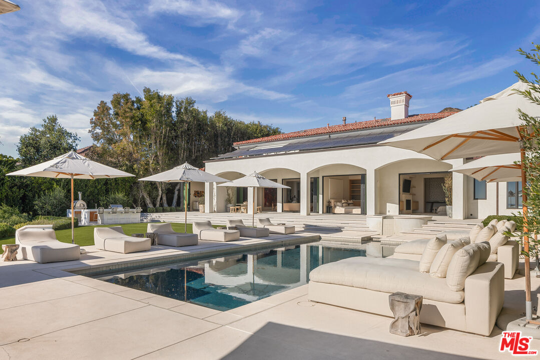Nestled on over 1.5 acres in the heart of Malibu, this stunning Modern Mediterranean compound offers complete privacy behind grand gates and a long private driveway, freshly transformed through a multi-year renovation by renowned celebrity designer Malgosia Migdal. The estate comprises three distinct structures: the main residence, a screening room/staff house with attached 3-car garage, and a separate two-bedroom guest house featuring its own gourmet kitchen, living room, and private patio. The main residence exudes editorial sophistication with expansive great, living, and dining rooms boasting 10- to 14-foot ceilings, European plaster walls, and wide-plank French white oak floors. The luxurious primary suite rivals the world's finest hotels, complete with dual baths, generous closets, a sitting room, and breathtaking views over the pool to the ocean beyond. The gourmet kitchen impresses with leather-finish stone countertops, sequence-matched rift-cut white oak cabinetry, top-tier Miele appliances, and a dramatic full-height stone backsplash. Outdoors, enjoy an iconic bluff-front pool with vast terraces, an outdoor kitchen, a fully lit tennis court accompanied by a viewing pavilion, and a grassy meadow ideal for events plus convenient stairs leading down to Malibu Road for direct beach access. Designer furnished and available for immediate occupancy, this turnkey vision is just minutes from the Malibu Country Mart, Nobu and Little Beach House.