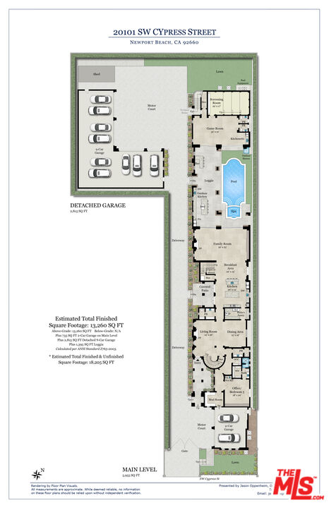 This private estate boasts impeccable craftsmanship and design on more than half an acre of flat land. Set behind private gates, this compound-like residence offers more than 18,200 sq. ft. of living space (including a 3,500 sq. ft., 11-car garage), five en-suite bedrooms, 10 baths, a soundproof home theater with memory foam carpet, a game room, office, wine cellar, an attached guest house with private entry, a spacious home gym, and much more. No expense was spared in this refined custom home, featuring premium finishes throughout, including limestone flooring, 12-ft. wood-beam ceilings, and palatial corridors. The gourmet kitchen is replete with state-of-the-art appliances, leathered granite countertops, a butler's pantry, and two kitchen islands with scratch- and stain-resistant Kedra countertops. The resort-style backyard showcases a pool/spa, outdoor shower, and a massive loggia with lounge areas, a bar, and a 1,500 sq. ft. covered outdoor kitchen featuring a built-in BBQ with a rotisserie, warming drawer, oversized glass refrigerator, nugget ice machine, and more. The 1,300 sq. ft. primary suite occupies its own wing, featuring an office or nursery space, a boutique-style walk-in closet, a spa bathroom, and a fireplace. Conveniently located on the upper level is a full-sized laundry room with dual washer and dryer units and a dog washing station; a third laundry set is situated in the lower-level butler's pantry. The entire main house is wired to a generator for power outages and is equipped with a Falsken water filtration system. It features built-in audio and an extensive video surveillance and monitoring system. This exclusive address offers a rare opportunity for those seeking privacy, opulence, and space, just minutes from the best destinations in Newport Beach.