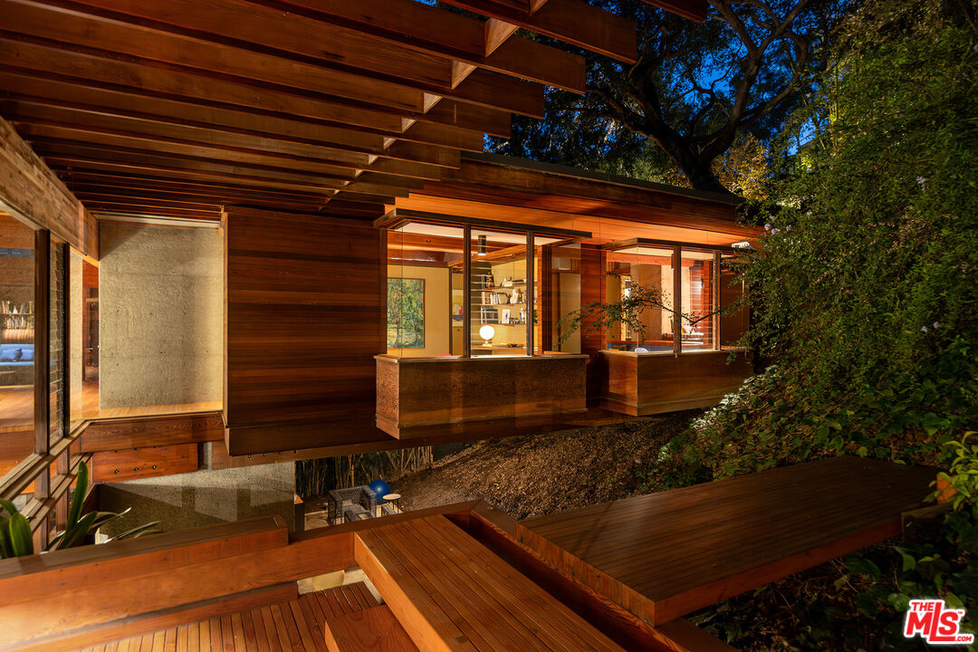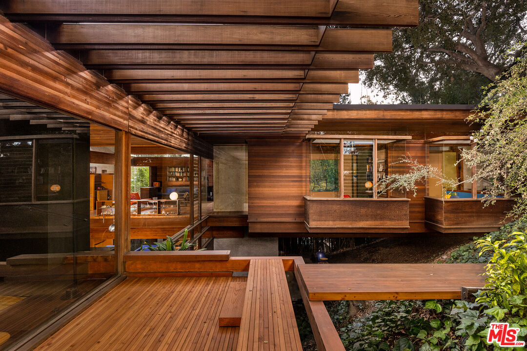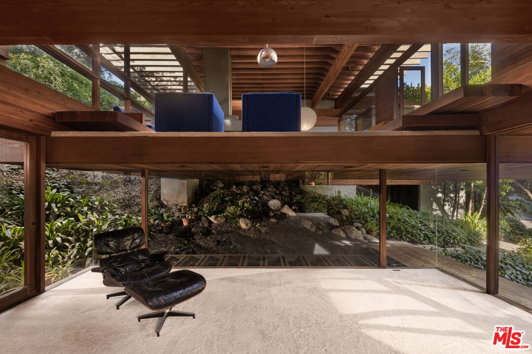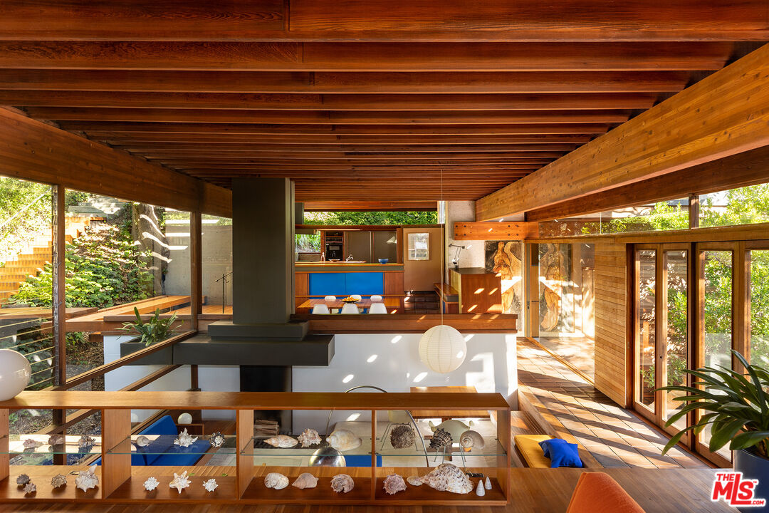The Kappe Residence, Ray Kappe, FAIA is a quintessential Mid Century Modern Masterpiece, and personal residence of architect / educator Ray Kappe. Floating above it's hillside terrain, natural landscape is allowed to flow undisturbed beneath its strong framework, representing a marriage between pure structural logic and lyrical sculptural design. Beautiful redwood ceilings and redwood detailing combined with walls of glass and massive skylights create a continuous symphony of direct, indirect and dappled light that animates the house from sunrise to sunset. Considered a work that is disciplined and deliberate, yet seemingly free and effortless, the 5 bedroom, 5 bath structure is described as both " essay and poem", Traditional spatial boundries are erased by seven split levels encompassing 4,157 square feet. Described by the L.A. Times as " The Greatest house in Southern California", designated as a Cultural Historical Monument in 1996, the residence represents a master class in the "additive process of design", embracing the surrounding landscape of Rustic Canyon. The primary suite anchors the northeast wing, while a suite of 3 bedrooms occupies the southwest wing, providing a balance between communal and private life. Below the main living area lies a glass walled studio with stunning views of the rock garden. The open living area has serene tree top views and custom designed Kappe furniture. Four unique outdoor spaces, including a dramatic cantilevered deck, create the perfect indoor- outdoor experience. There is a stunning lap pool, spa, sauna and cabana with additional kitchen and bath. The estate is a modern vessel for enduring legacy, a global icon of residential architecture that continues to be a mecca for scholars and admirers of iconic architecture worldwide. The distinguished provenance is deeply intertwined with Los Angeles history, as it functioned as Kappe's residence , office and creative studio, gestating the inspiration & design for over 200 of his projects. As the "birthplace" of SCI-Arc, it represents a singular opportunity for the stewardship of a national treasure. Shown to pre-qualified clients only.