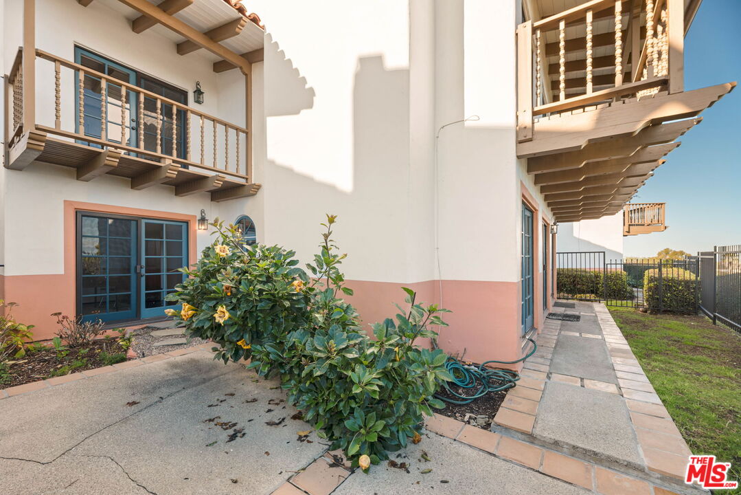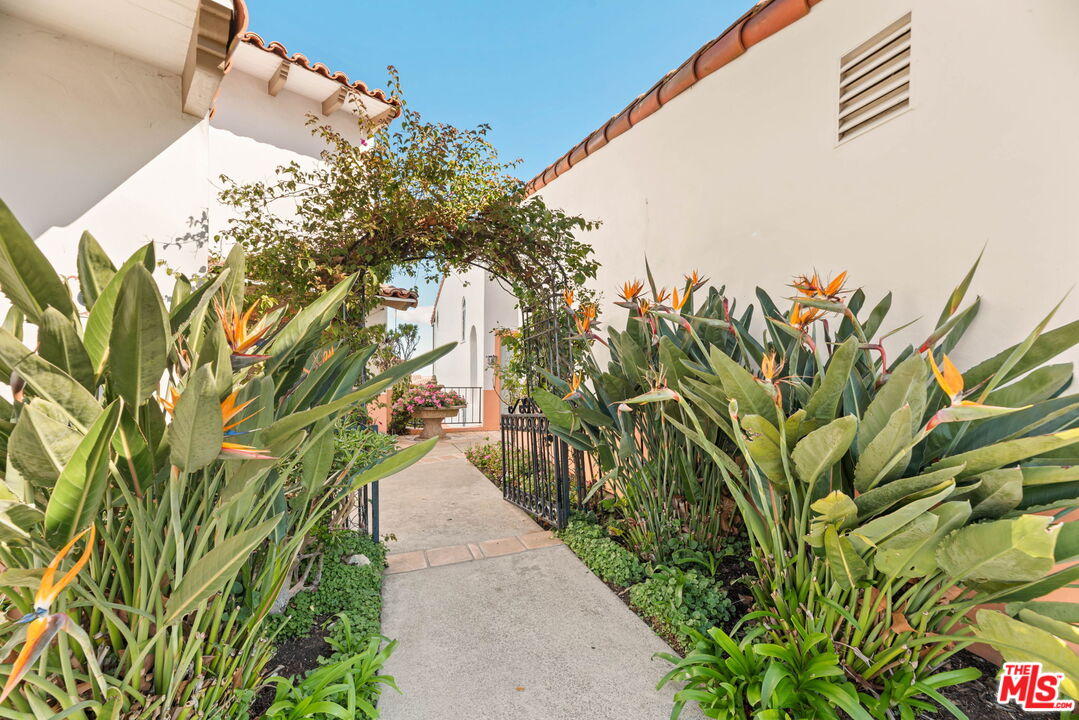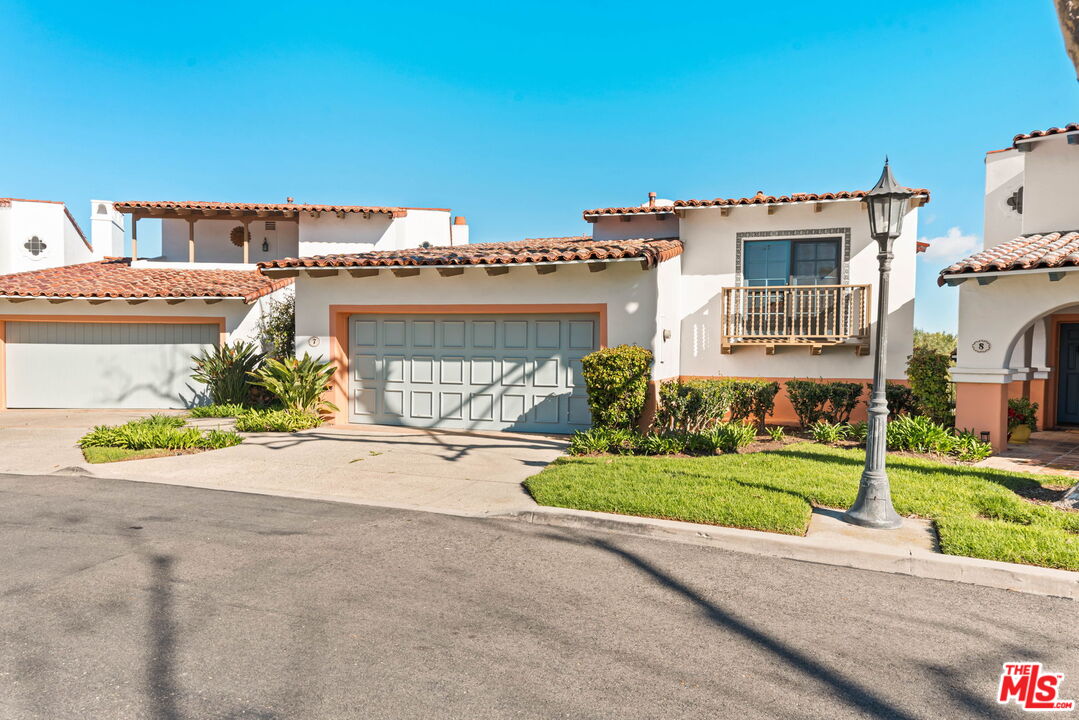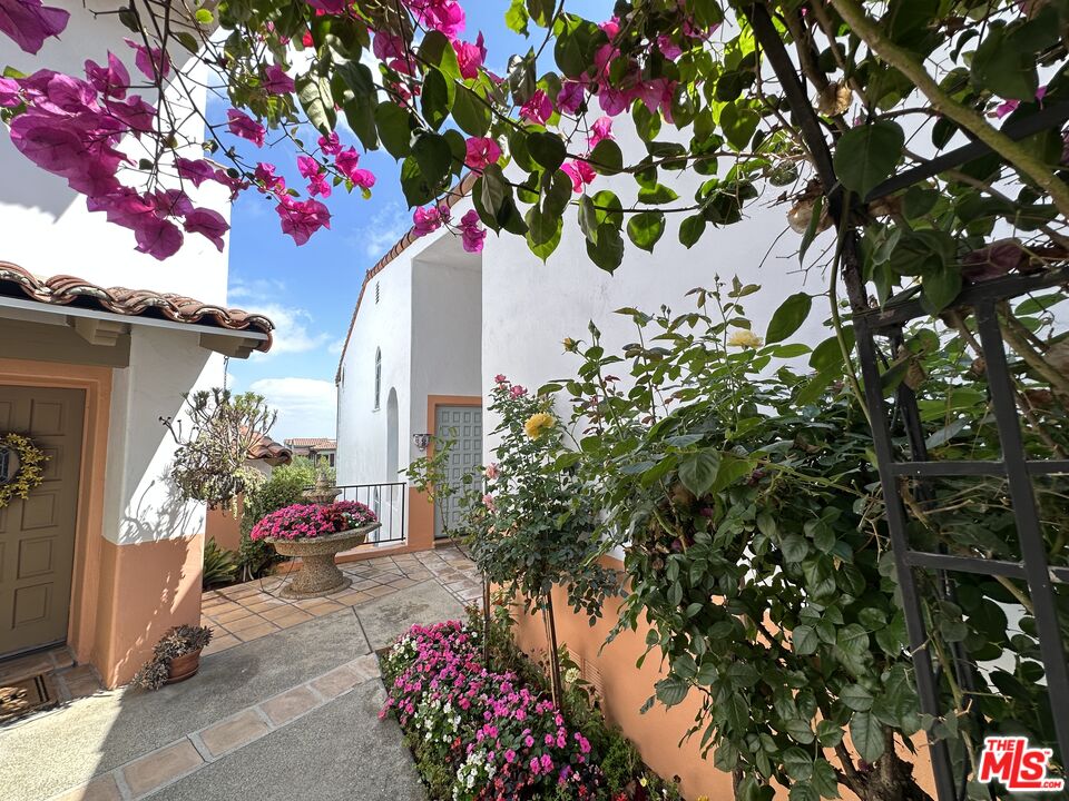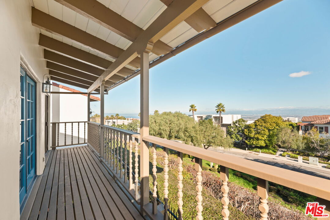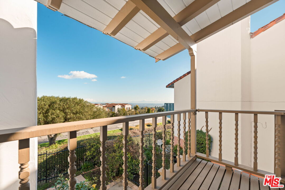 Coastal Elegance Meets Spanish Heritage in Rancho Palos Verdes. Offering an unrivaled vantage point overlooking the shimmering Queen's Necklace coastline, Downtown skyline, the Hollywood sign, and mountain tops over to the Port of Long Beach. This rare standalone townhome serves as a beautiful expression of Spanish Colonial Revival design, nestled within a private, gated enclave of just ten residences for the ultimate sanctuary in secure boutique living. Upon entering through a fragrant, flowered stucco courtyard, you are greeted by an interior of architectural integrity defined by soaring vaulted ceilings, exposed timber beams, and classic arched walkways that lead seamlessly to a formal dining room. Authentic terracotta flooring and one-of-a-kind hand-painted tiles run throughout the residence, creating a grounded Mediterranean ambiance that extends into the gourmet kitchen, which features a six-burner Viking cooktop, double GE Profile convection ovens, and a charming dining nook that opens to one of three spacious upper-level patios. The lower-level primary suite serves as a true retreat, opening via a series of French doors to a private gated backyard and featuring an innovative dual-wing bathroom with a shared Spanish-tiled tub and shower. Two additional bedrooms on the opposite wing, one of which is perfectly suited as an executive den or office, ensure complete privacy for guests. Offering the solitude of a single-family home with the effortless luxury of gated community amenities like a gorgeous pool and clubhouse, this unique Rancho Palos Verdes offering provides a peaceful, secure setting just moments from the area's premier shopping and dining.