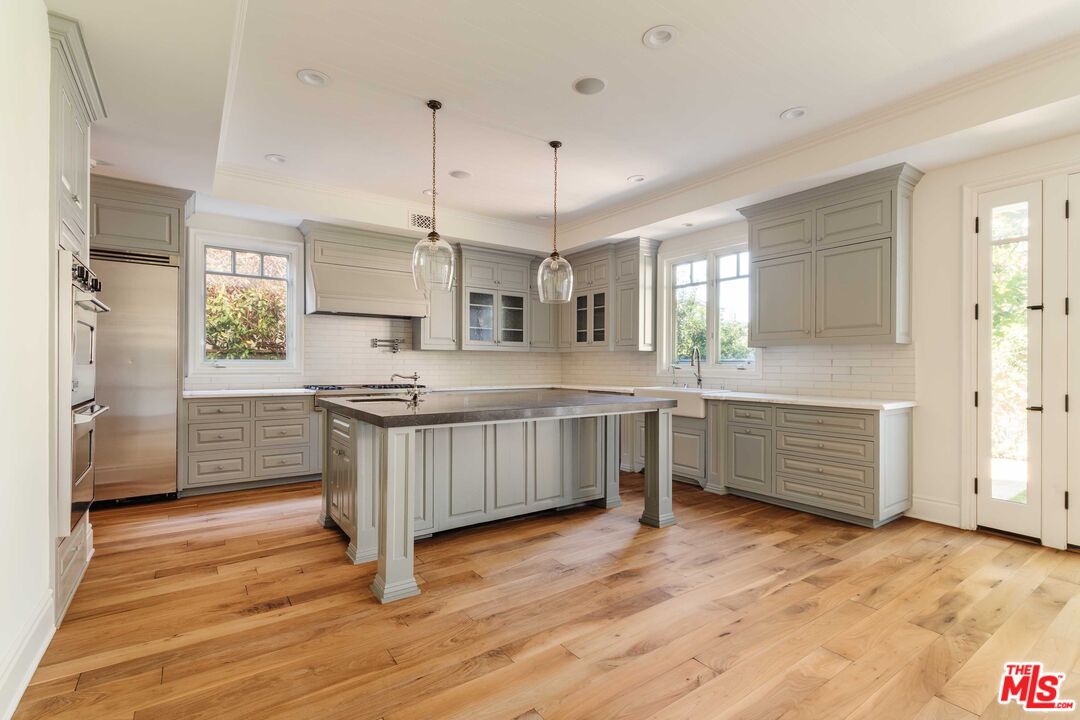 Set on a picturesque tree-lined street in the coveted Santa Monica Canyon, this private Traditional home blends modern luxury with timeless design across a thoughtful floor plan. Guests are welcomed through a gated, grassy front yard into a stately foyer with vaulted ceilings and a striking capiz shell chandelier. Hardwood floors lead past the formal living and dining rooms to the open-concept heart of the home - featuring a family room with fireplace and chef's kitchen boasting a large island, Viking appliances, and an adjacent breakfast area. French doors open to a tranquil backyard ideal for al fresco dining, lounging, and play. A butler's pantry and walk-in pantry connect the kitchen to the dining room. Completing the main level are a guest suite, office with built-ins, powder room, laundry room, and two-car garage. A dramatic, light-filled staircase leads to four bedroom suites upstairs. The luxurious primary suite features vaulted ceilings, a generous walk-in closet, private covered terrace with fireplace, and a spa-like bath clad in Arabescato marble with dual vanities, a large shower, and a soaking tub. All three upstairs bedrooms are ensuite with two sharing a jack-and-jill bathroom. A homework/desk area and built-ins/storage complete this level. Located within the Canyon Elementary School District, tenants also enjoy the best of the Canyon lifestyle with a short stroll to Rustic Coffee, the Santa Monica Stairs, and neighborhood favorites like Giorgio Baldi, Caff Delfini, and the Golden Bull - plus the beach just a few blocks away. Experience refined comfort and exceptional design on one of Santa Monica Canyon's most desirable streets. Home may be leased furnished - call listing agents for details.